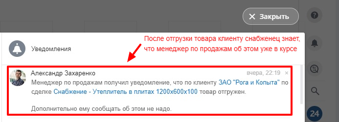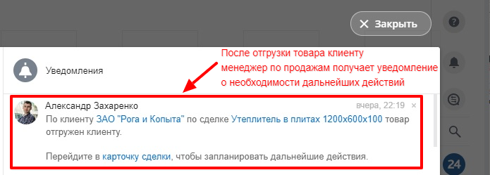 После отгрузки товара клиенту менеджер по продажам получает уведомление о необходимости дальнейших действий