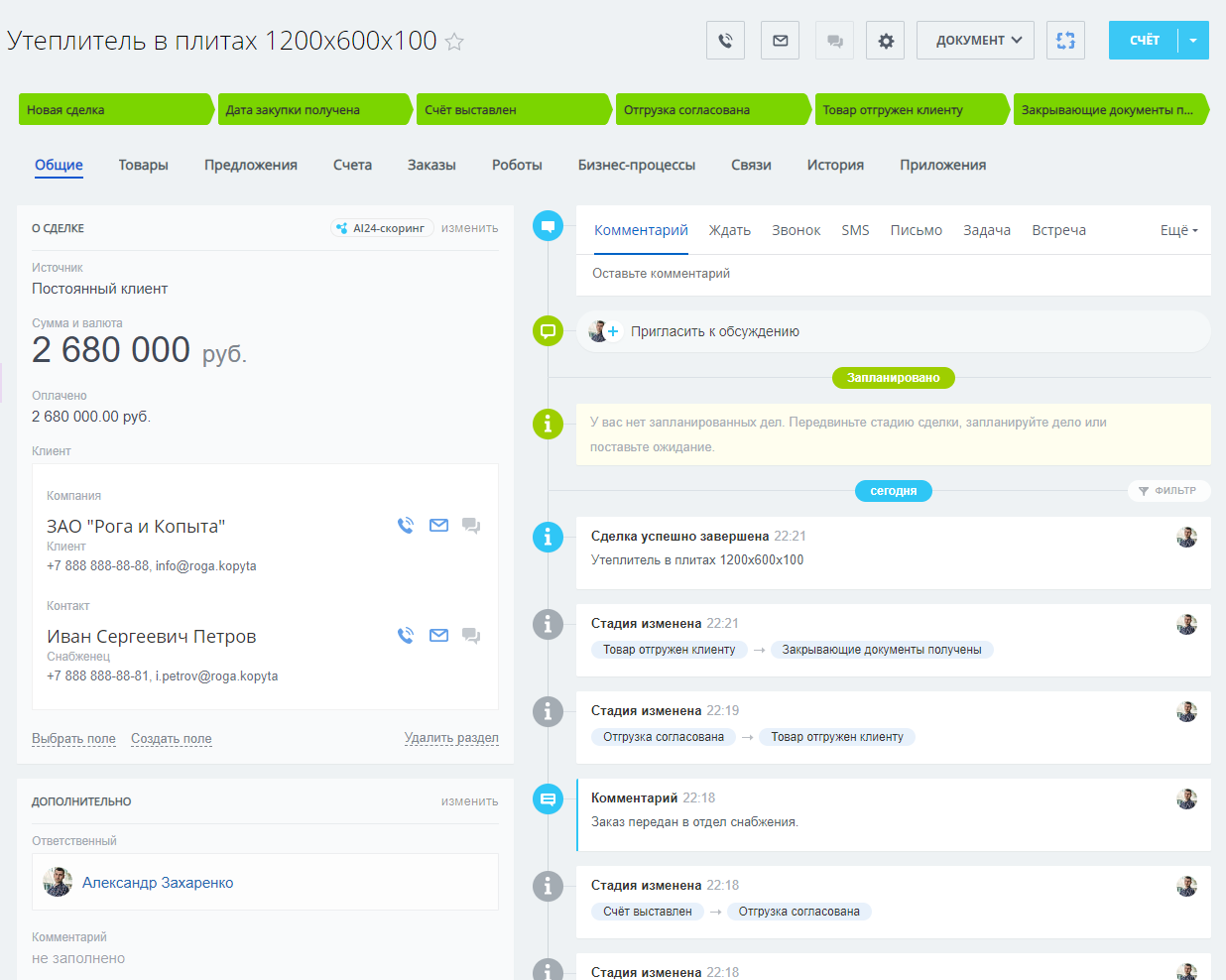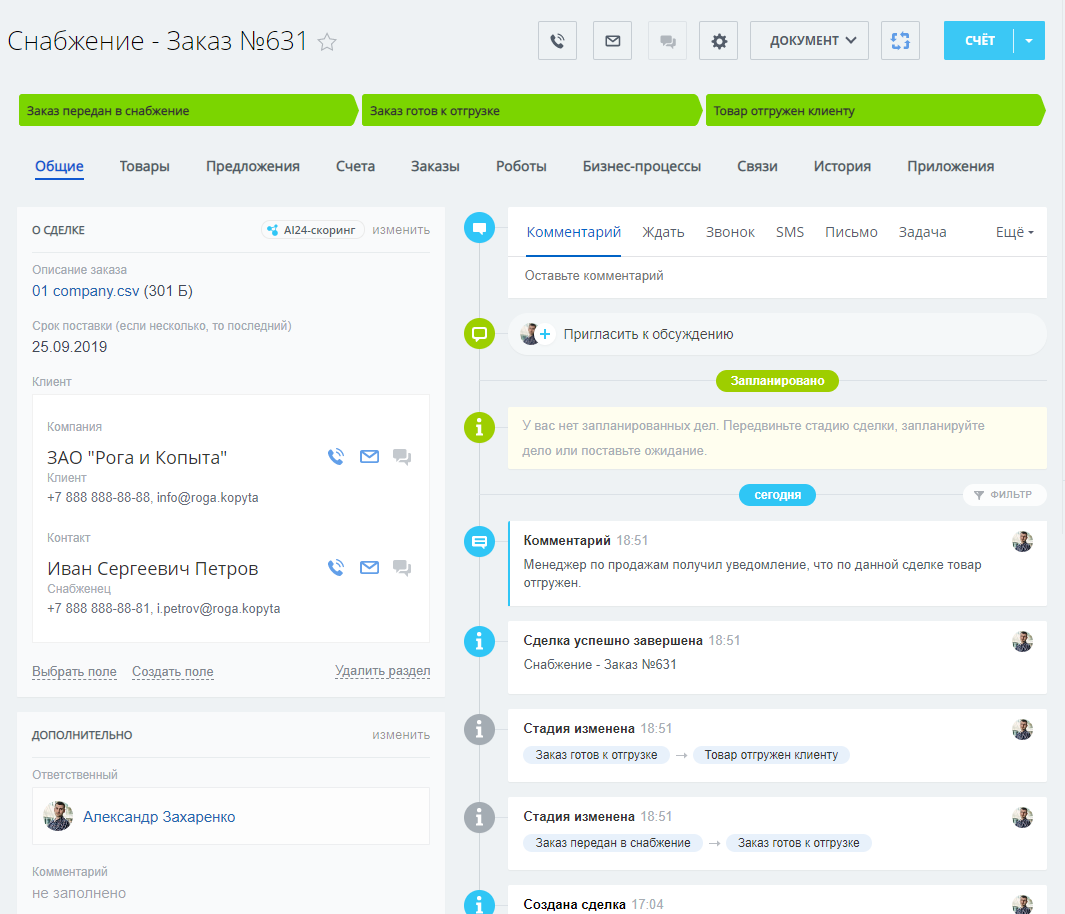 - Автоматическая передача заказа в снабжение и обратно. После согласования отгрузки CRM-система запрашивает у менеджера по продажам необходимые данные и сама передаёт их в снабжение. А после отгрузки заказа клиенту сообщает об этом менеджеру по продажам.