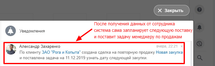 После получения данных от сотрудника система сама запланирует следующую поставку и поставит задачу менеджеру по продажам