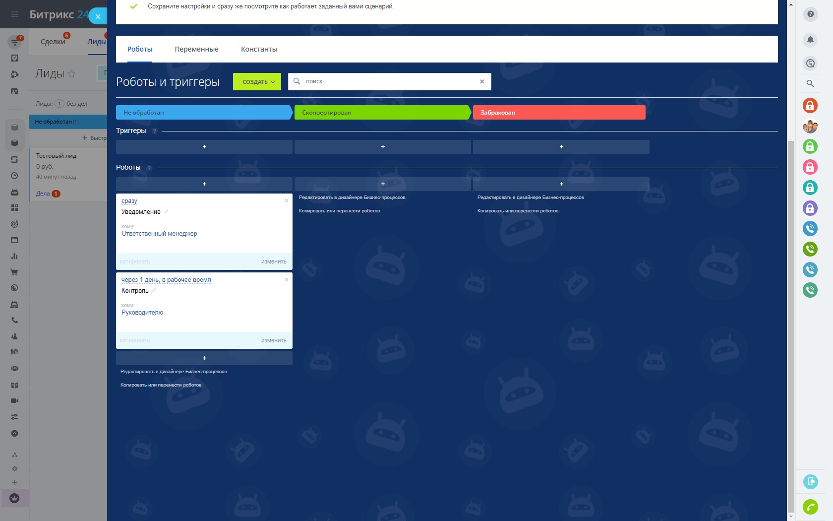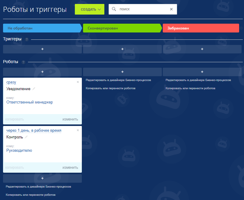 - автоматическая постановка задач сотрудникам в зависимости от стадии;