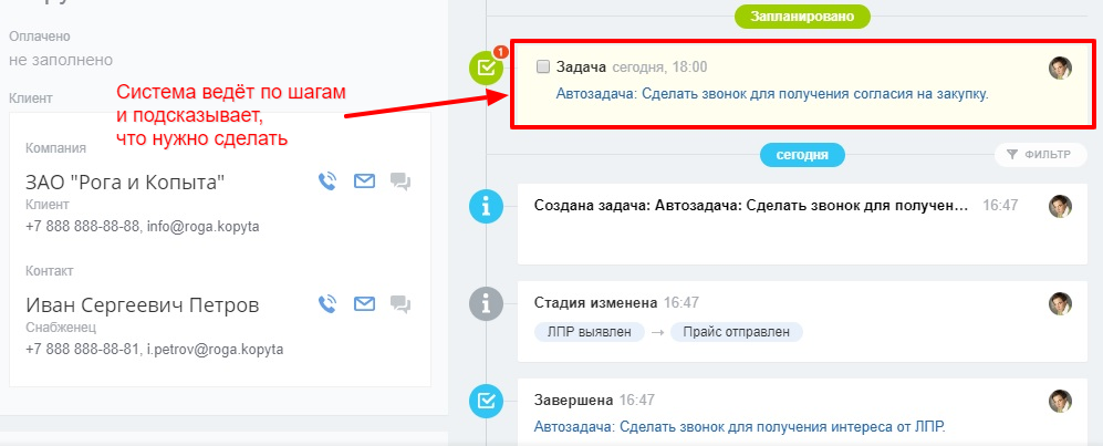 - Удержание внимания на повторных продажах. После успешной продажи CRM-система сама затребует у менеджера по продажам дату следующего контакта с клиентом и проведёт менеджера по шагам.