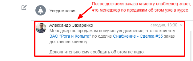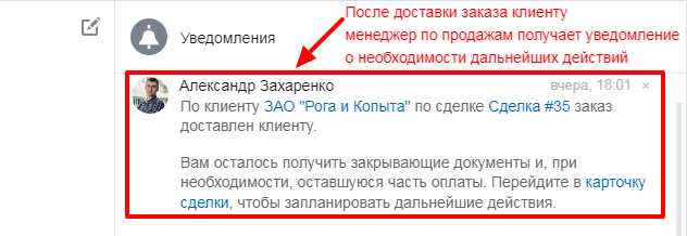 - автоматическое информирование менеджера по продажам о том, что заказ доставлен клиенту;