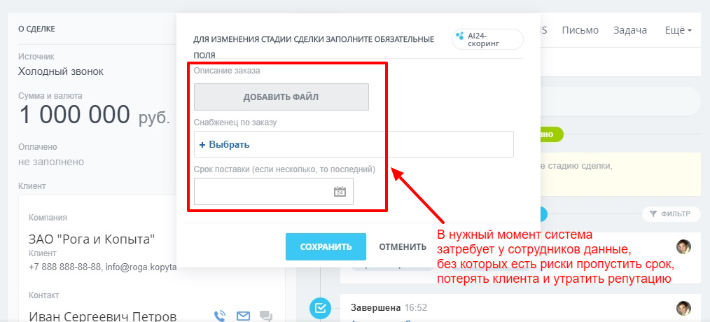 В нужный момент система затребует у сотрудников данные, без которых есть риск пропустить срок, потерять клиента и утратить репутацию