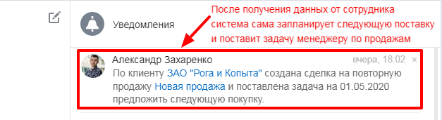 После получения данных от сотрудника система сама запланирует следующую поставку и поставит задачу менеджеру по продажам
