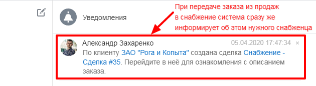 При передаче заказа из продаж в снабжение система сразу же информирует об этом нужного снабженца