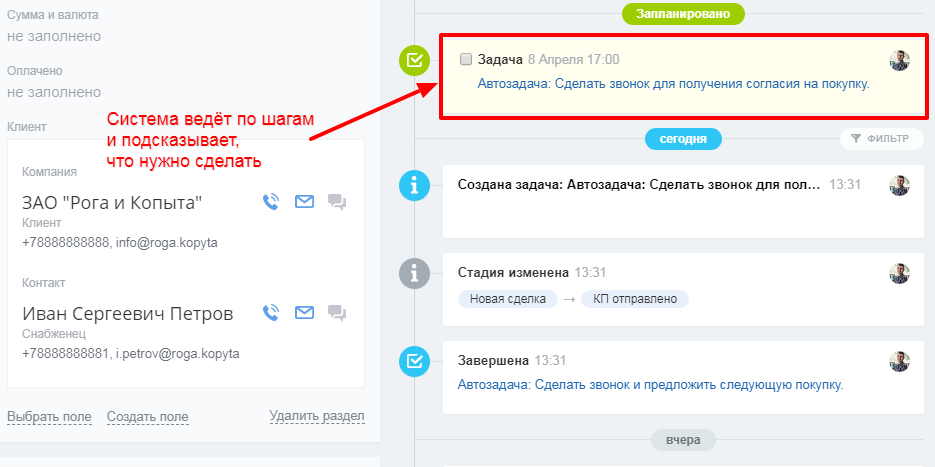 - Удержание внимания на повторных продажах. После успешной продажи CRM-система сама затребует у менеджера по продажам дату следующего контакта с клиентом и проведёт менеджера по шагам.