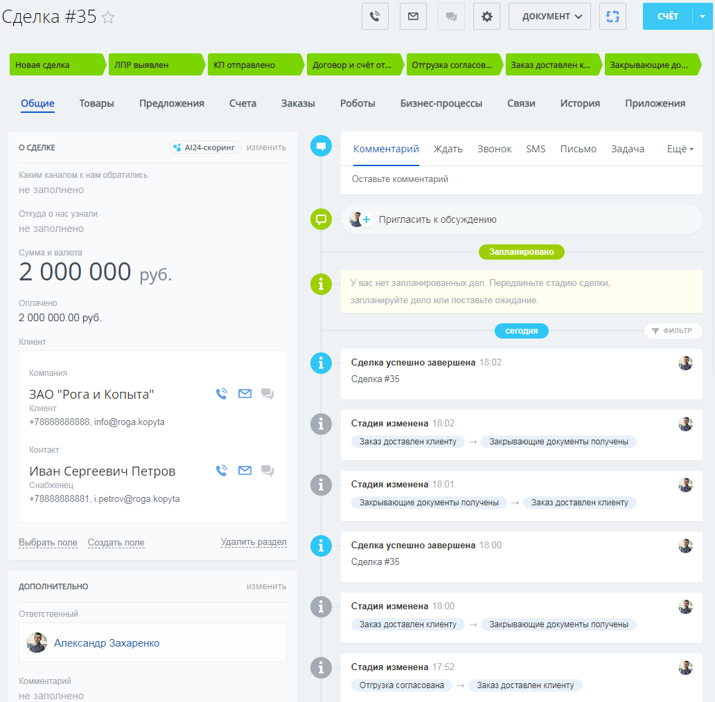 - автоматическая постановка задач сотрудникам в зависимости от стадии;
