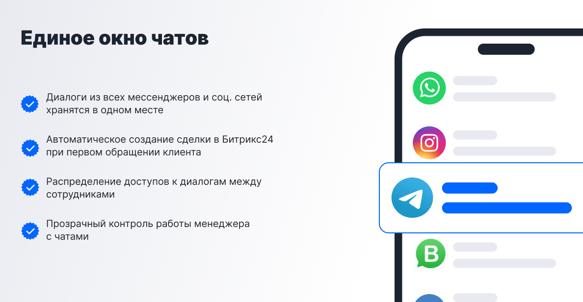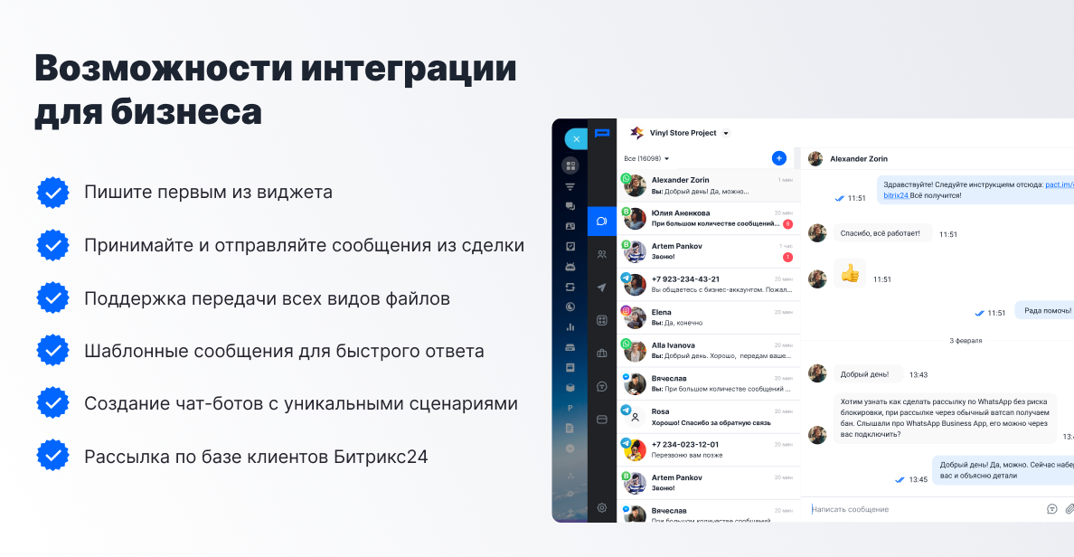 Интеграция позволяет менеджеру перевести всё общение с клиентами в Битрикс и не переключаться между мессенджерами и сделками.
