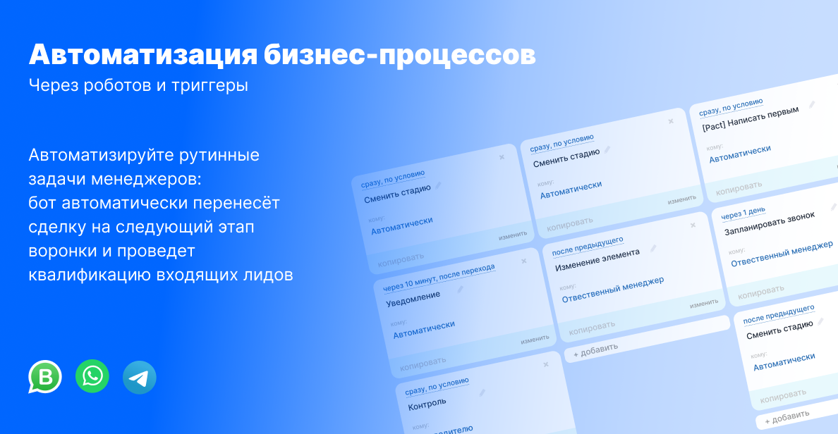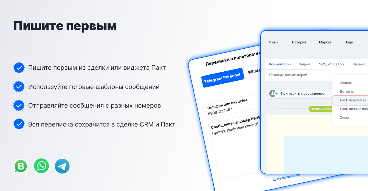 - Писать первым в WhatsApp и Telegram прямо из сделки