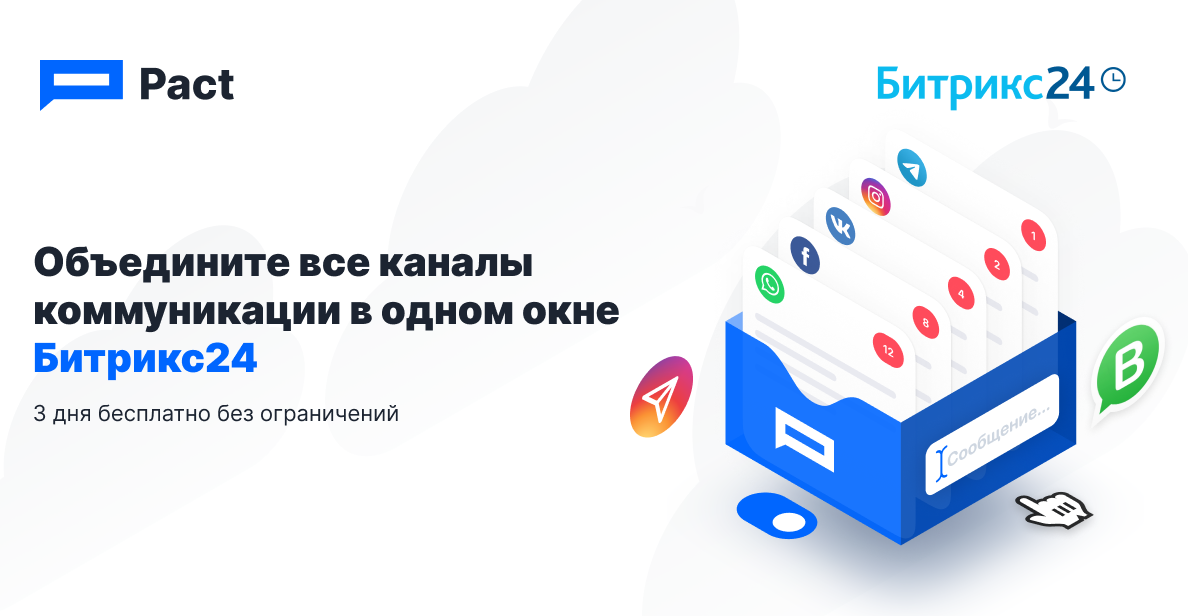 Пакт- удобная и простая интеграция мессенджеров и Битрикс24. Омниканальная платформа сервиса объединяет все мессенджеры и соц. сети в единое окно чатов.
