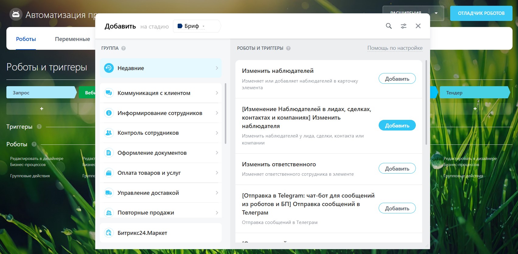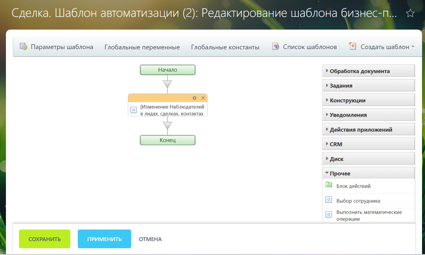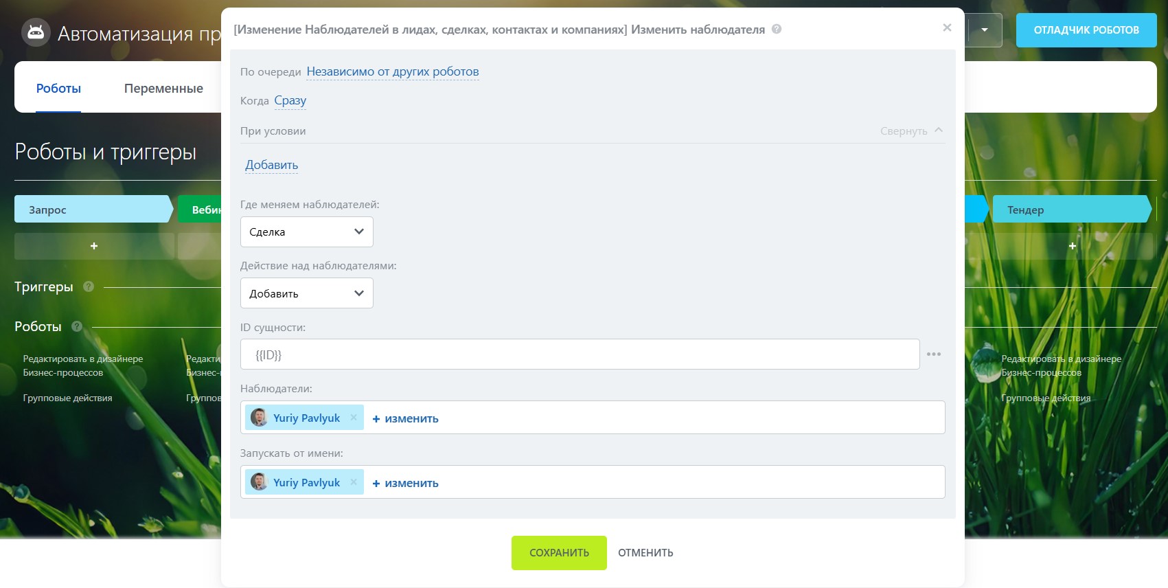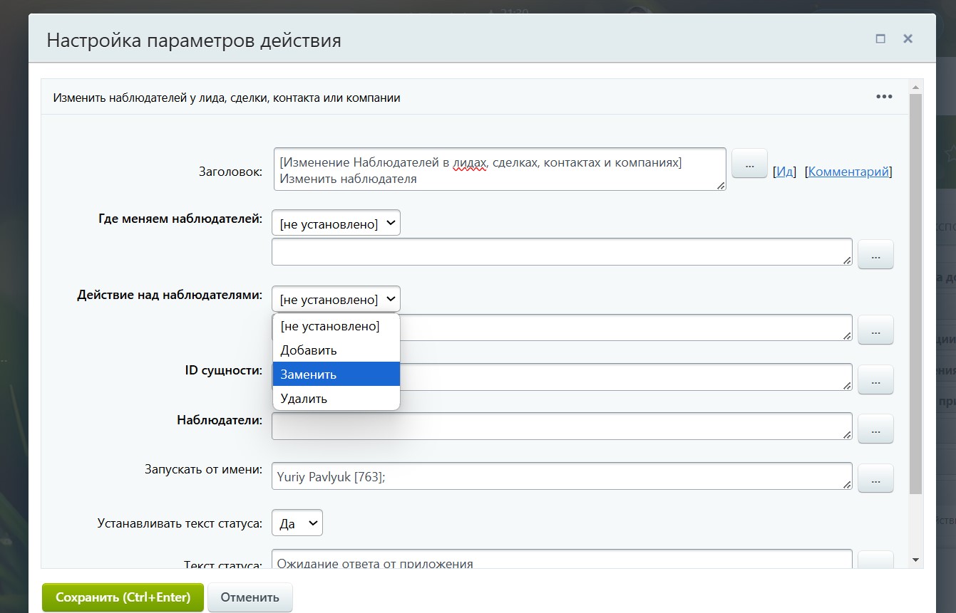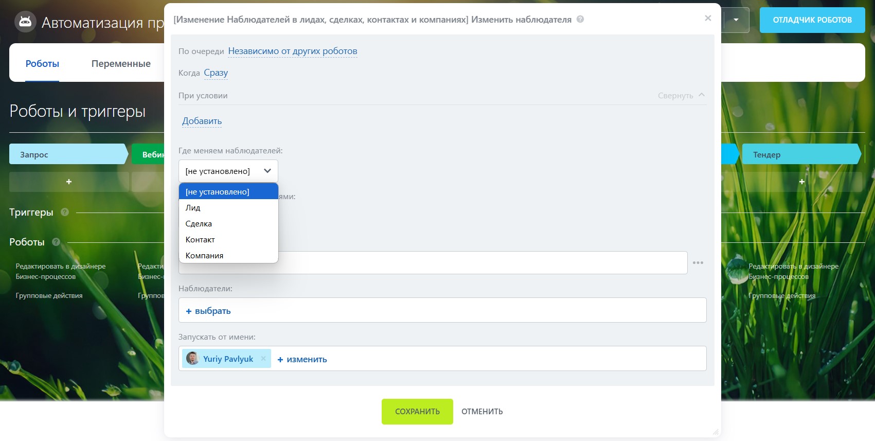 Функционал позволяет добавить, удалить или заменить одного или нескольких наблюдателей в Лиде, Сделке, Контакте или Компании.