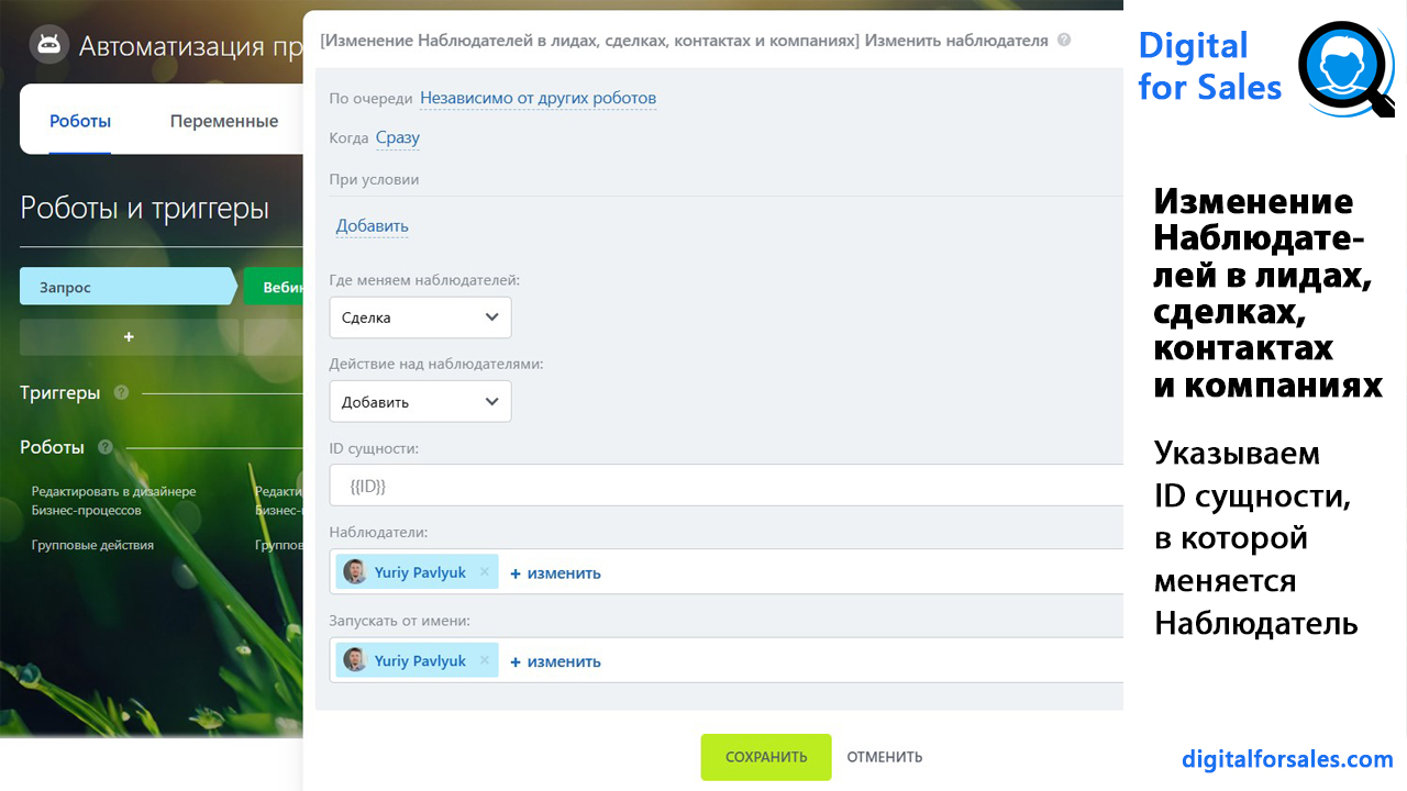Активити «Изменить наблюдателей»: программно добавляет или убирает сотрудников из контакта, компании, сделки или лида.