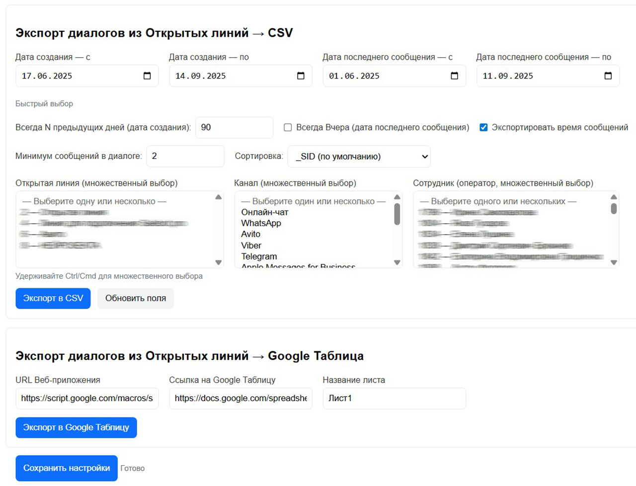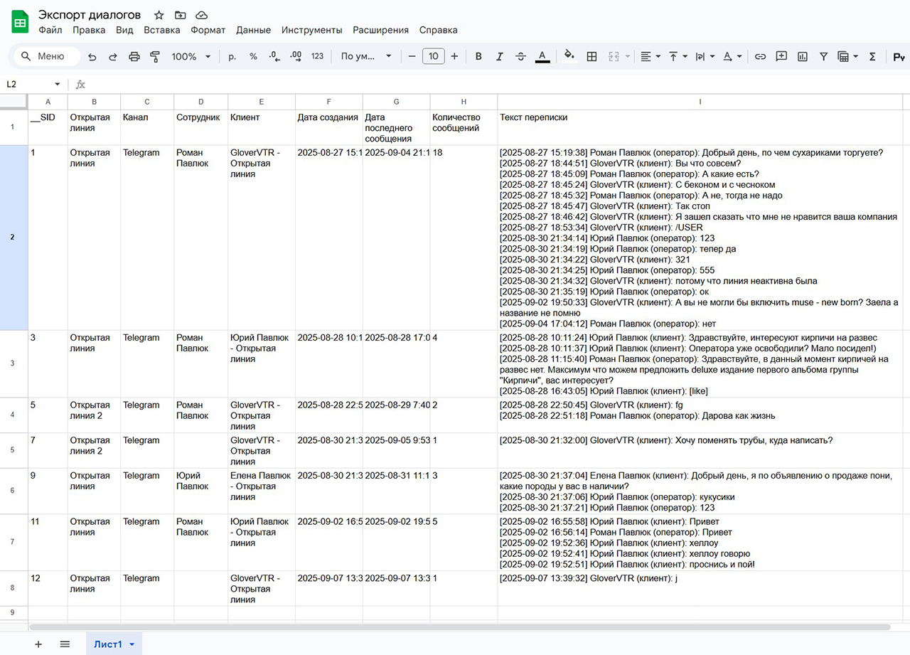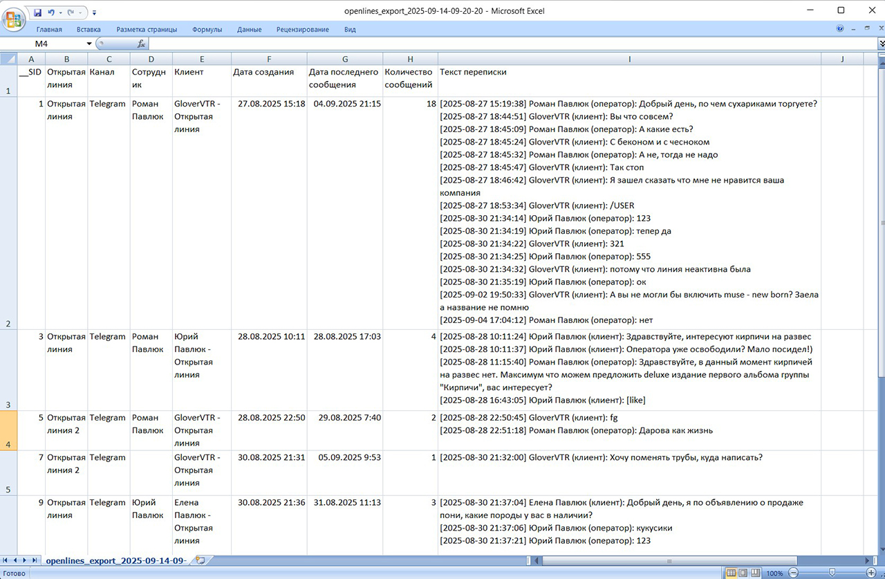 Экспорт диалогов из Открытых линий
