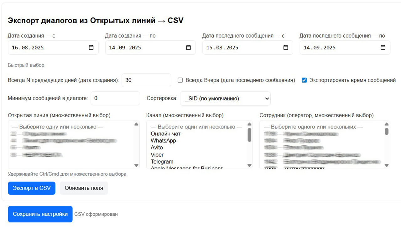 При большом количестве диалогов понадобится достаточно продолжительное время на формирование файла CSV. Поэтому если у вас много диалогов – лучше сделать несколько экспортов (за разные периоды). Ибо только фильтры по времени реально уменьшают выборку. А вот фильтры по открытым линиям, каналам, сотрудникам применяются уже после того, как получен массив данных.