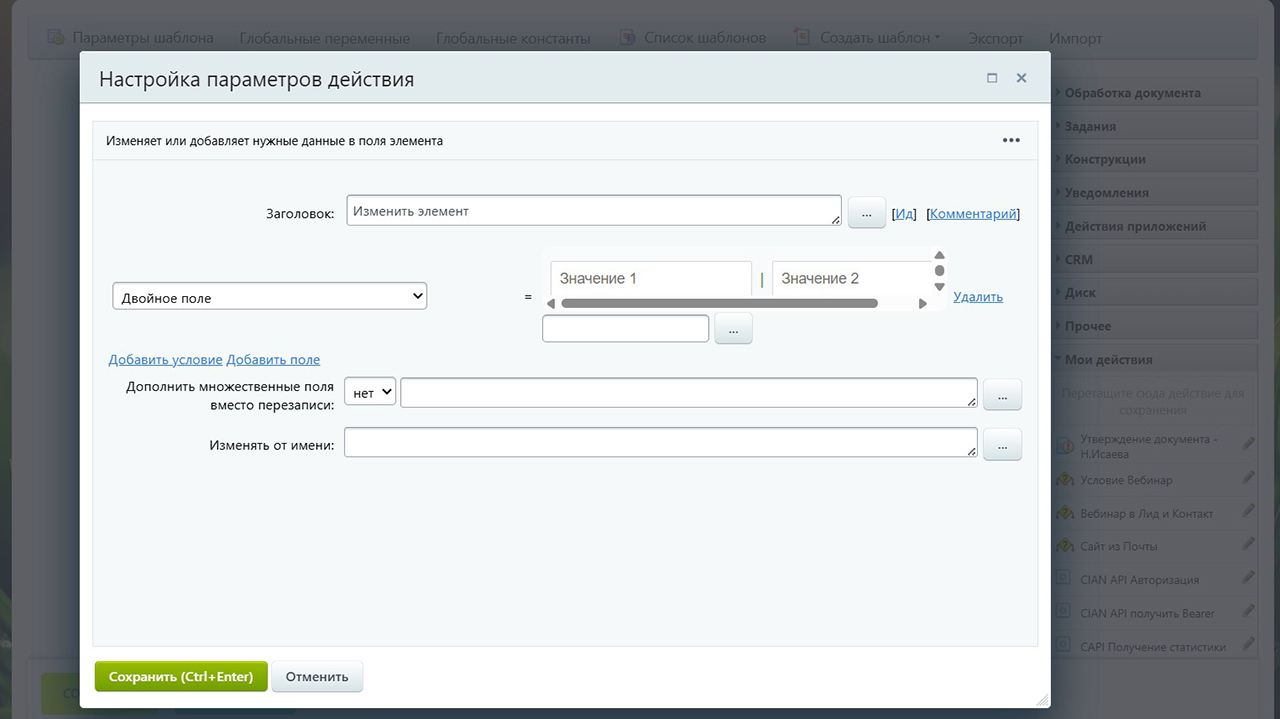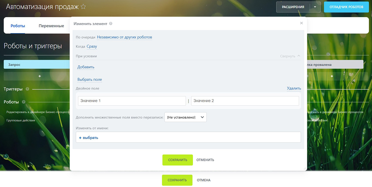Приложение добавляет новый вид полей в карточках элементов CRM и смарт-процессов, а также соответствующих роботов – “Двойные поля” и "Тройные поля (3 в 1)".