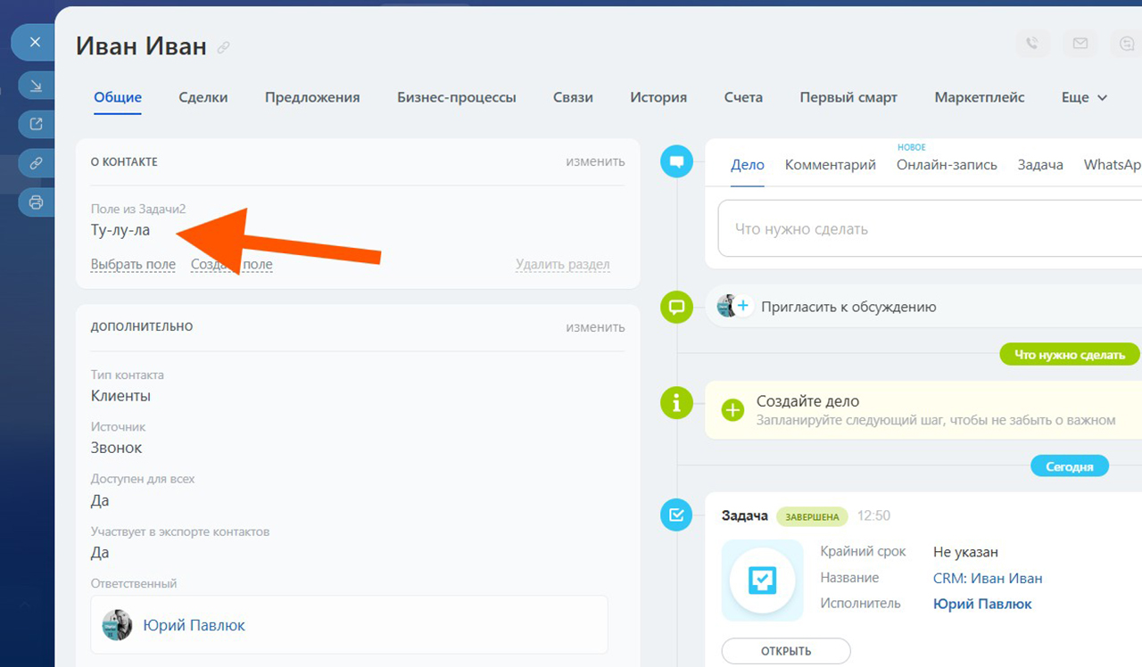 По факту выполнения задачи зачастую необходимо передать данные из ее полей в связанную карточку. Штатными средствами автоматически (при завершении задачи) “перебросить” информацию невозможно.