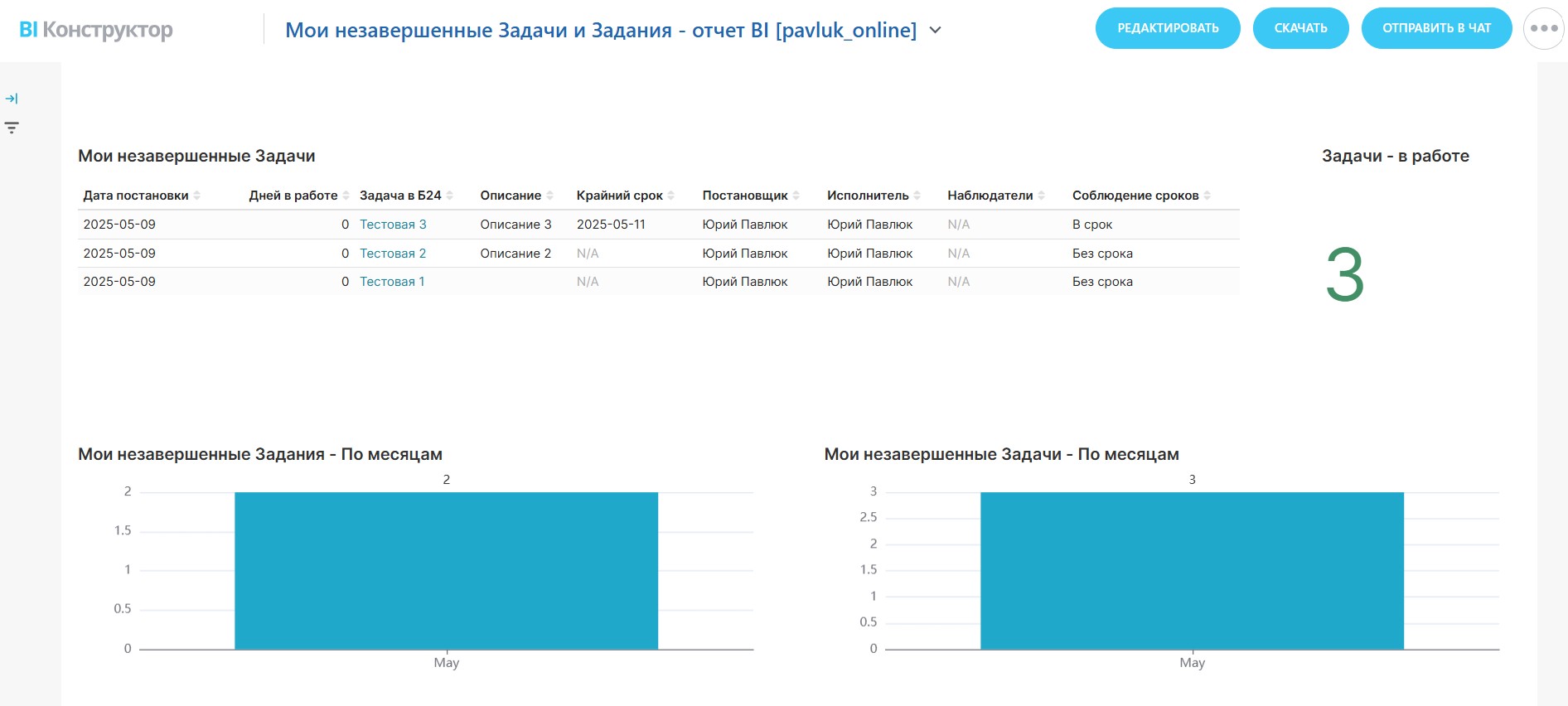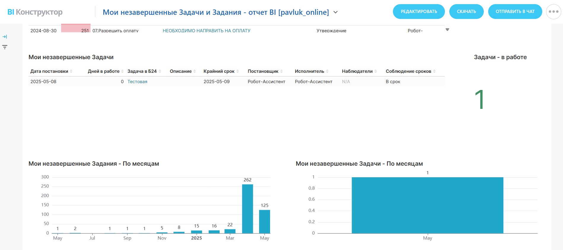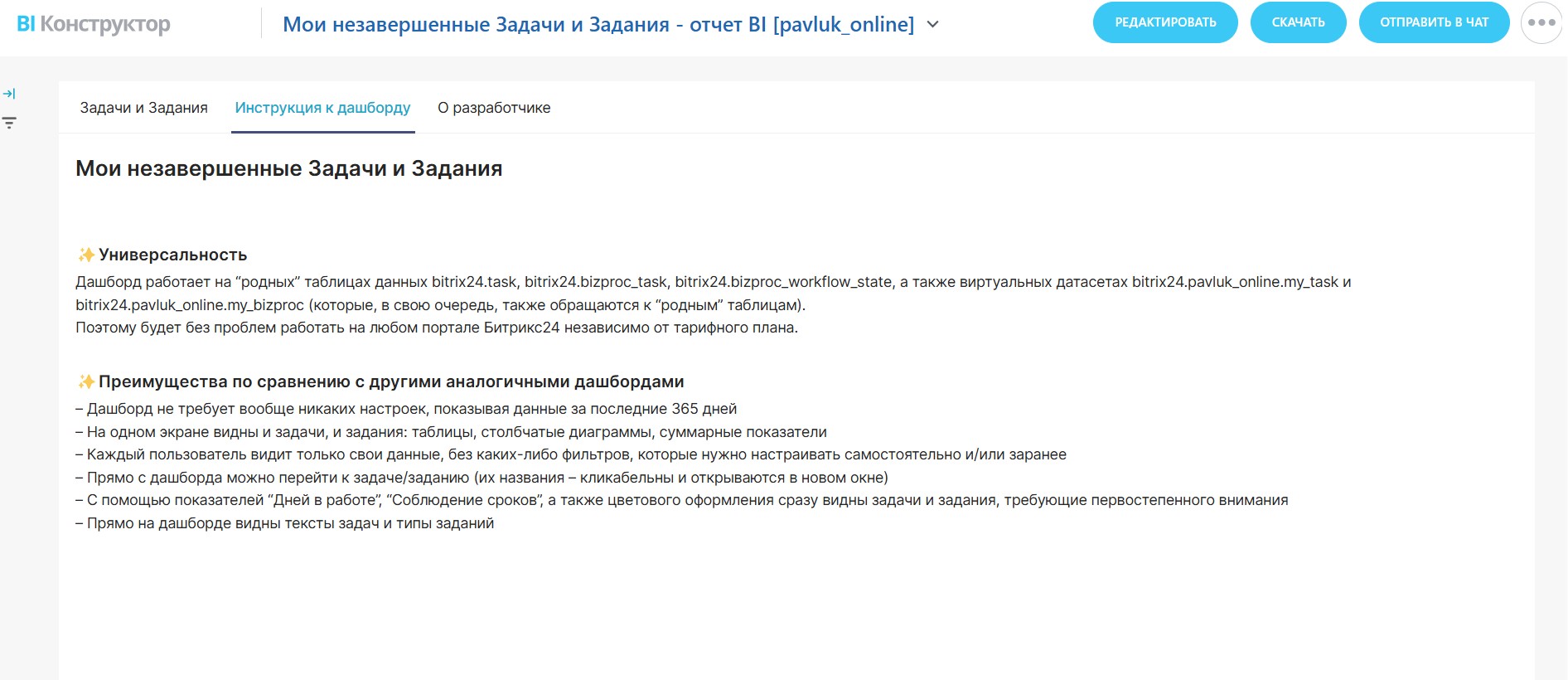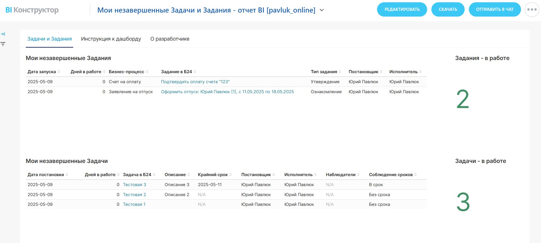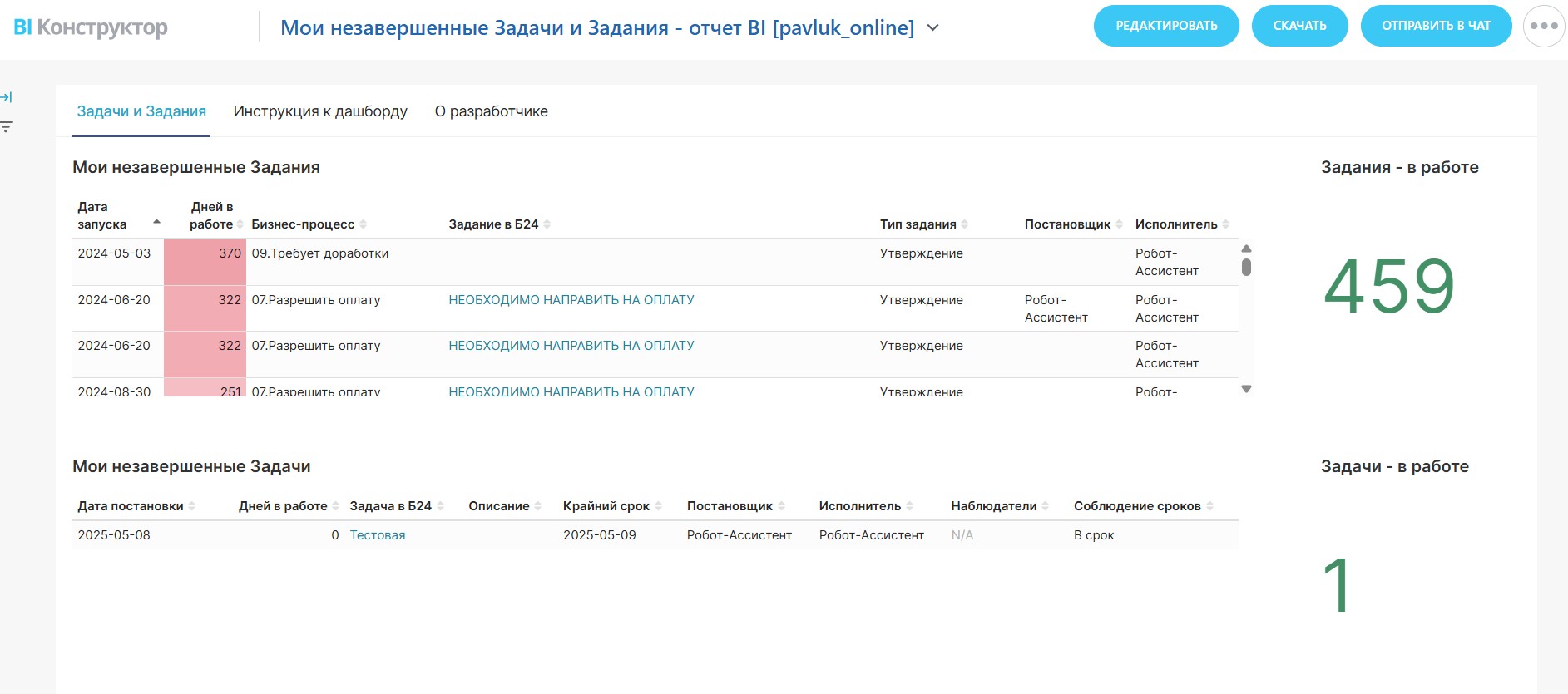 Дашборд работает на “родных” таблицах данных bitrix24.task, bitrix24.bizproc_task, bitrix24.bizproc_workflow_state, а также виртуальных датасетах bitrix24.pavluk_online.my_task и bitrix24.pavluk_online.my_bizproc (которые, в свою очередь, также обращаются к “родным” таблицам).