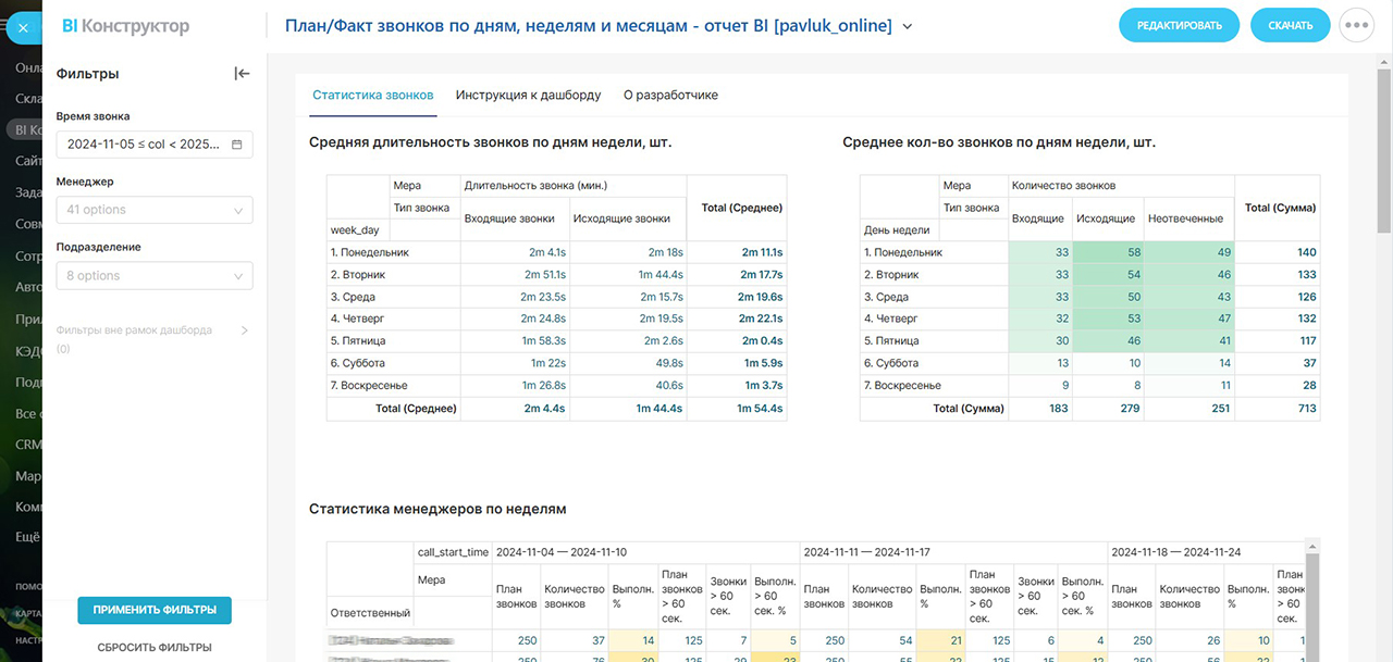 Дашборд работает на “родной” таблице данных bitrix24.telephony_call, а также виртуальном датасете bitrix24.pavluk_online.telephony_call_by_weekday (который, в свою очередь, также обращается к таблице bitrix24.telephony_call).