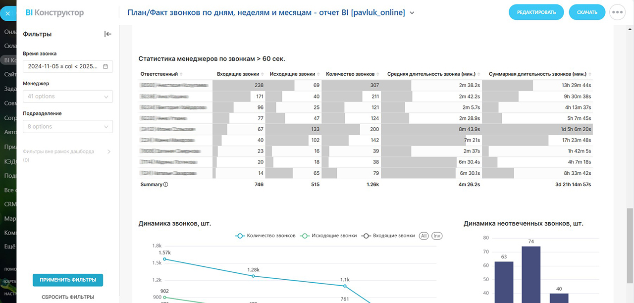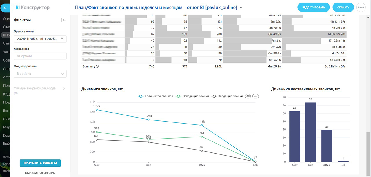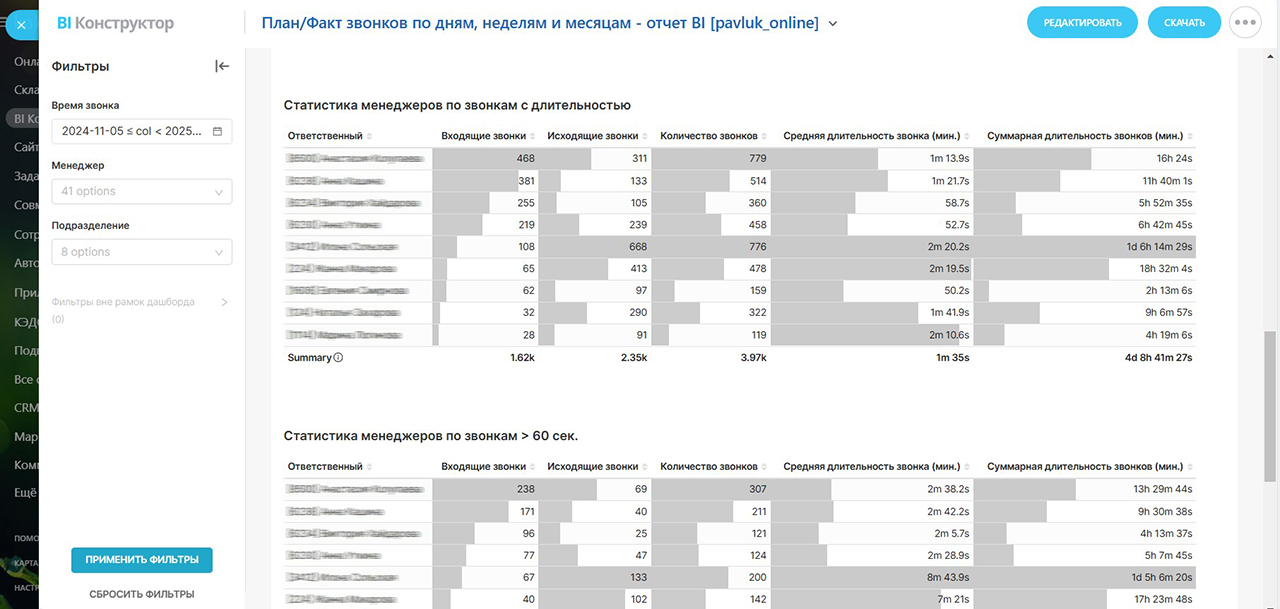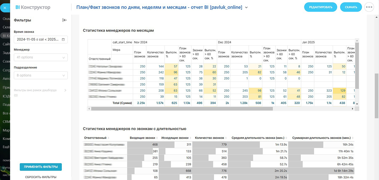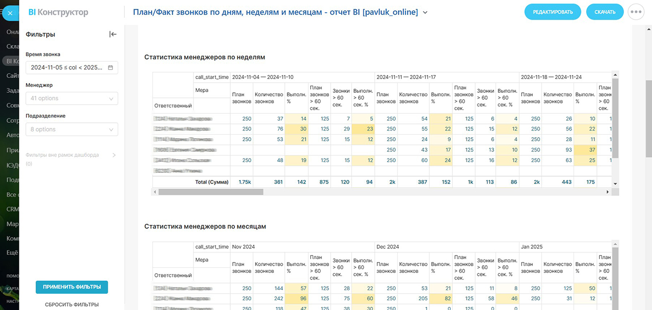 – В большинстве таблиц дашборда отображается как фактическое, так и плановое количество звонков.