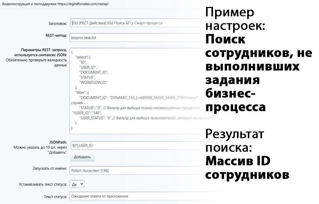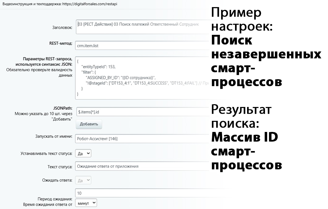 Оно позволяет запускать любые REST-методы Битрикс24 прямо из роботов и БП. Результат можно обработать через JSON и JSONPath.