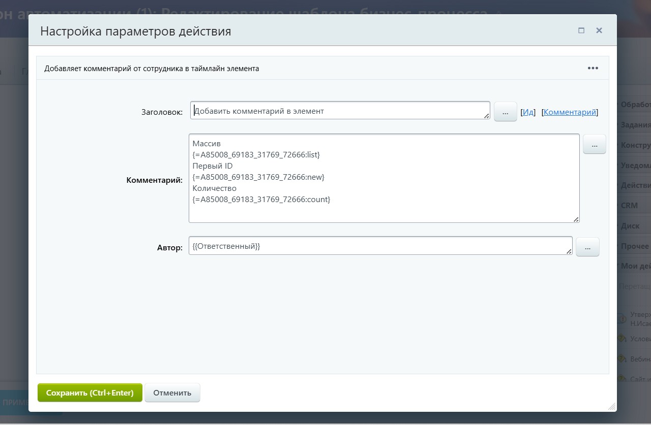 – Массив ID найденных элементов. Его можно использовать в последующих роботах, умных сценариях, шаблонах и дизайнере бизнес-процессов (например, в итераторе);