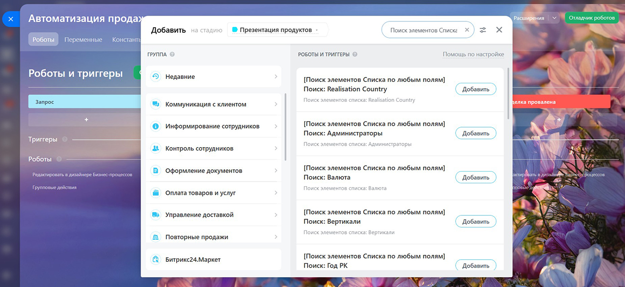 Важно, что роботы доступны в любом разделе портала: в лидах, сделках, умных сценариях, шаблонах бизнес-процессов и, разумеется, списках.