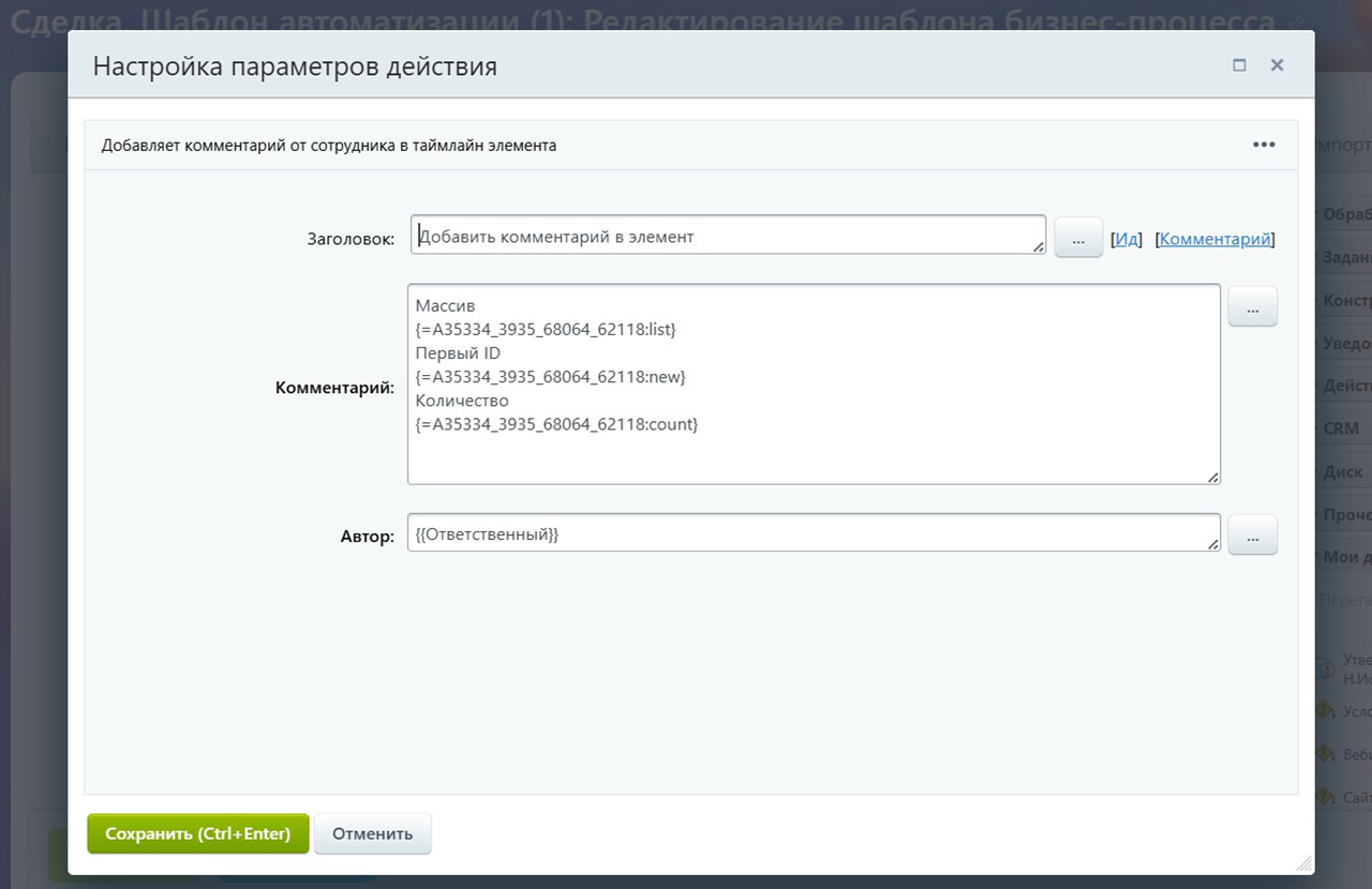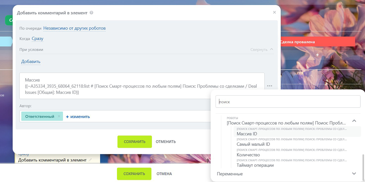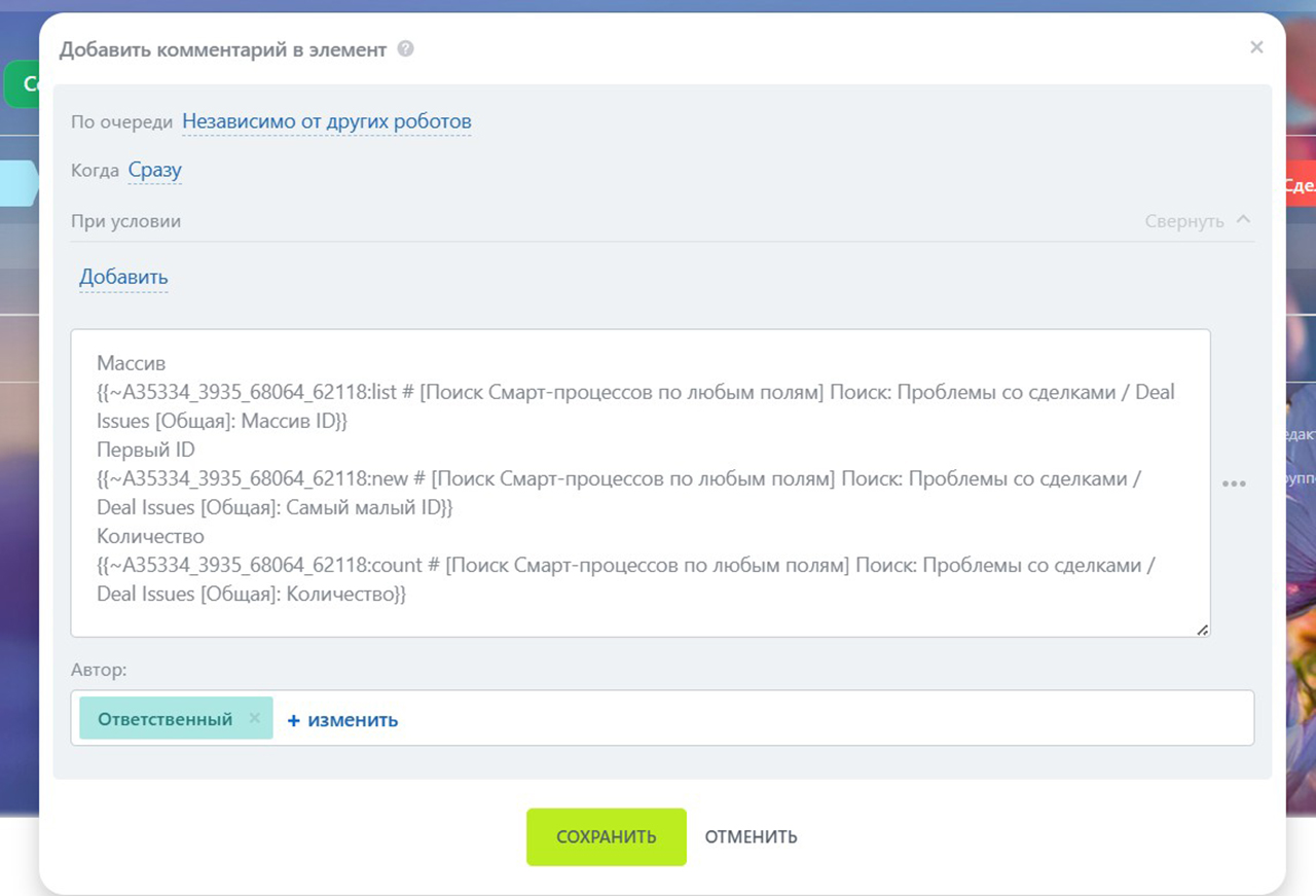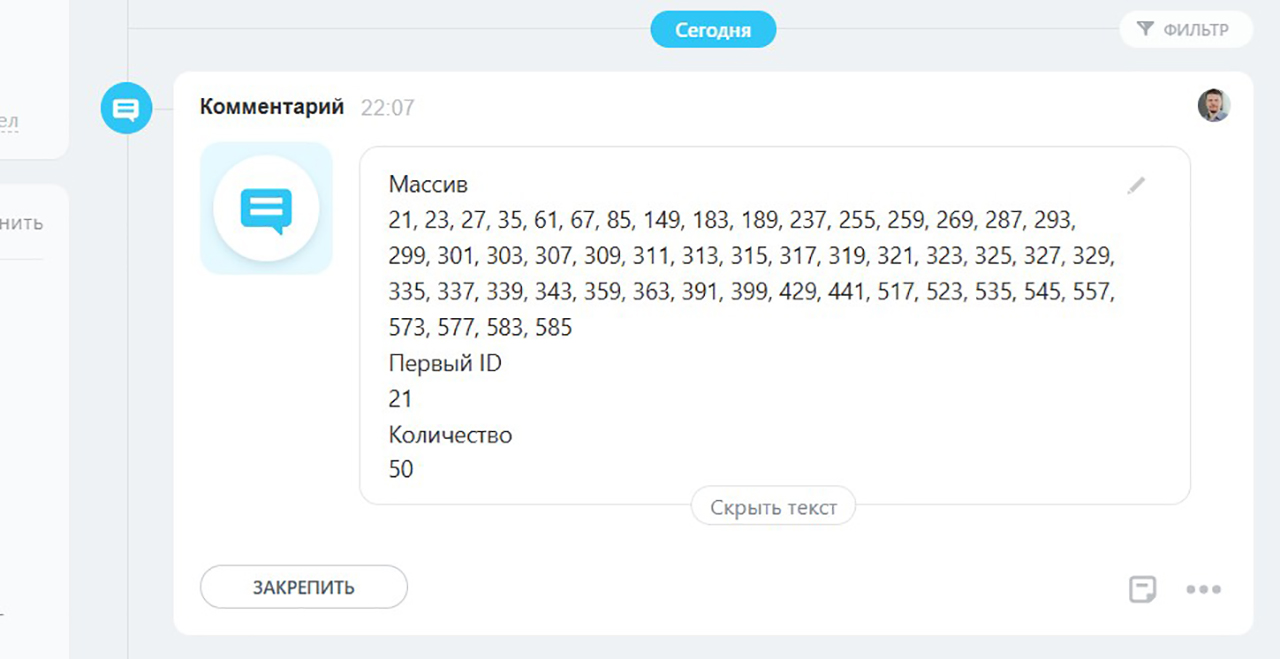 – Массив ID найденных элементов. Его можно использовать в последующих роботах, умных сценариях, шаблонах и дизайнере бизнес-процессов (например, в итераторе);