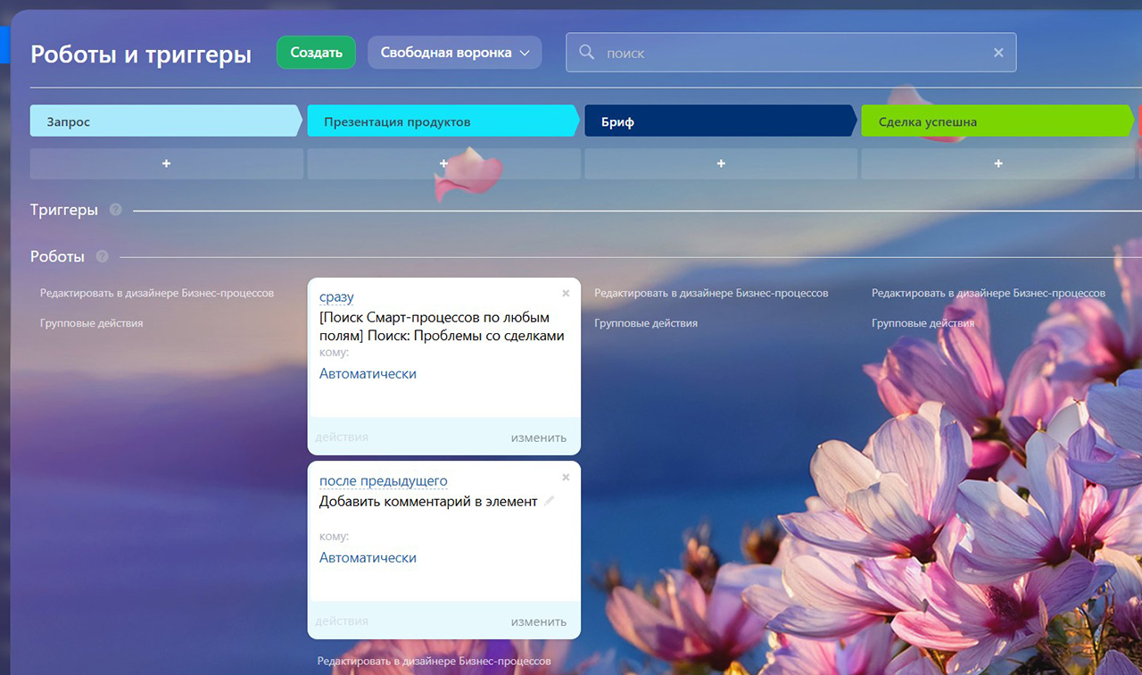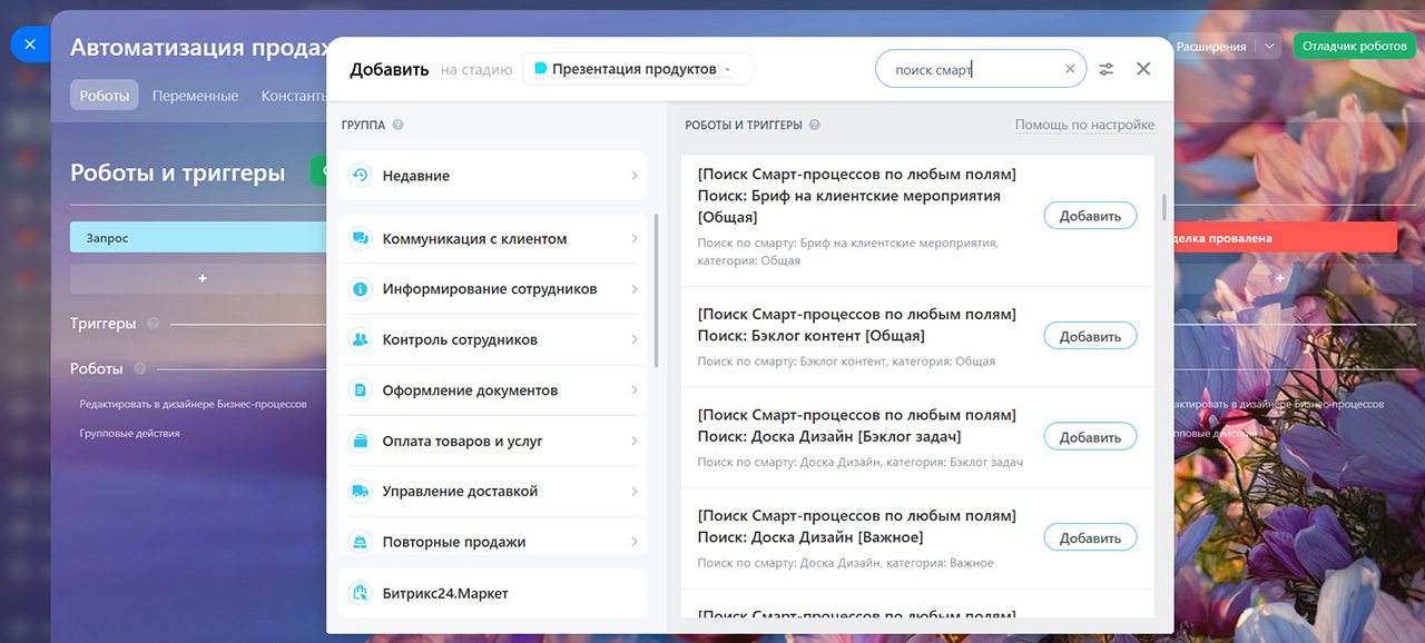 Важно, что роботы доступны в любом разделе портала: в лидах, сделках, умных сценариях, шаблонах бизнес-процессов и, разумеется, смарт-процессах.