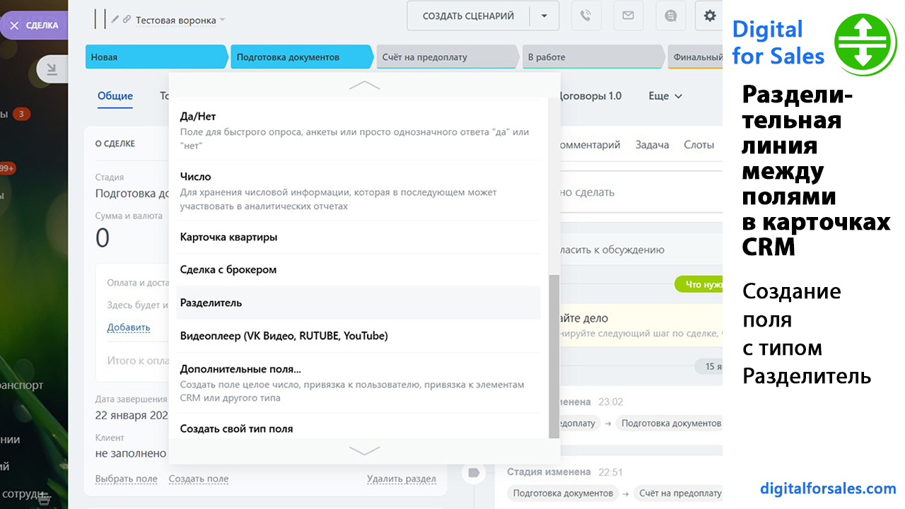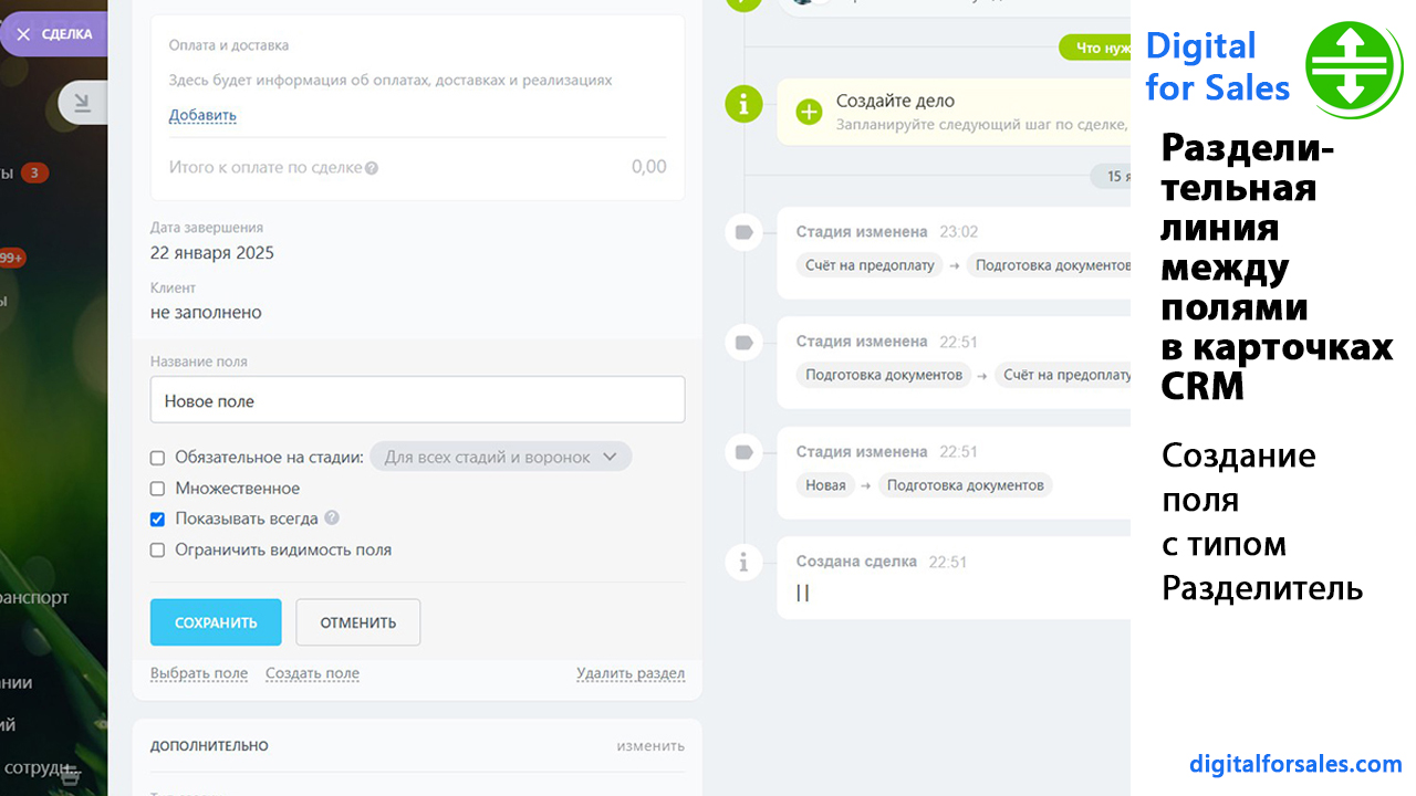 Лендинг приложения:https://separator.digitalforsales.ruТекстовая версия видео:https://digitalforsales.com/case/razdelitelnaya-liniya-mezhdu-polyami-v-kartochkah-crm