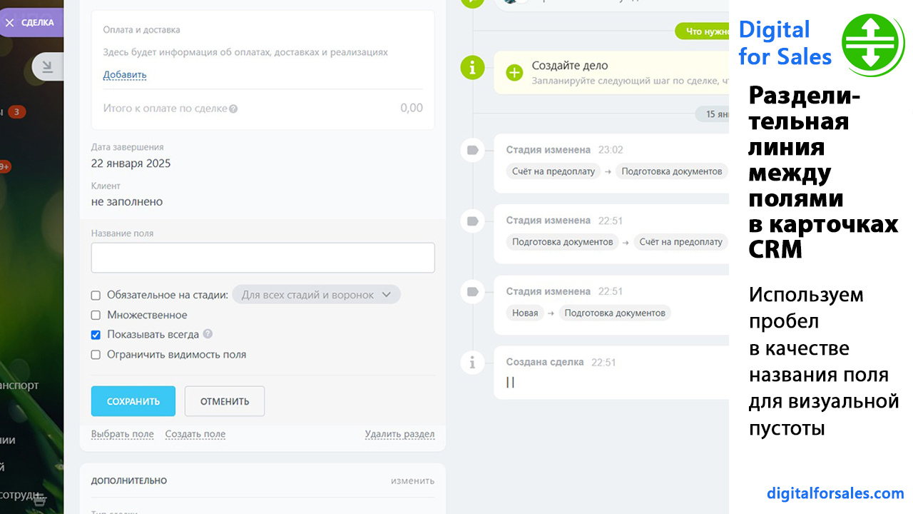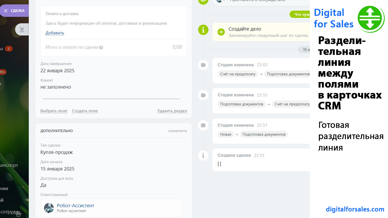 Например, если в одном блоке есть поля, которые менеджер должен заполнить вручную, и ниже идут поля, рассчитываемые автоматически, разделительная линия помогает сразу показать границу между ними. Это снижает количество ошибок и делает работу в CRM понятнее.