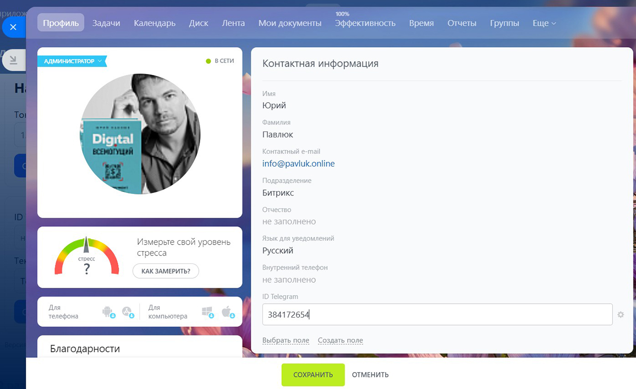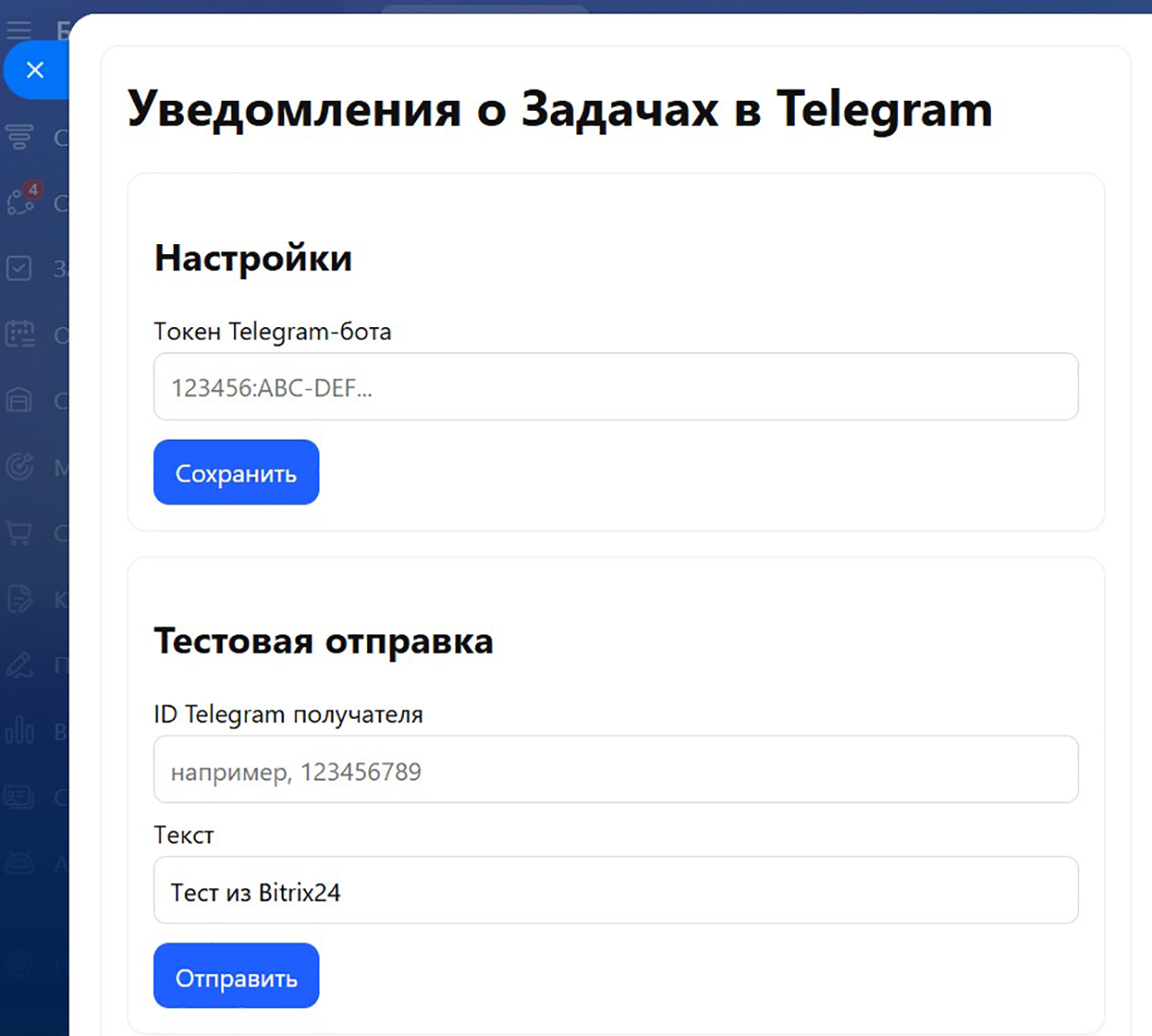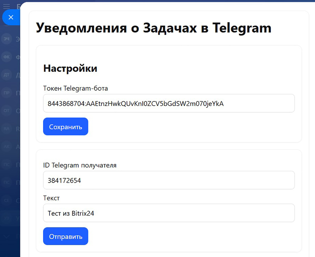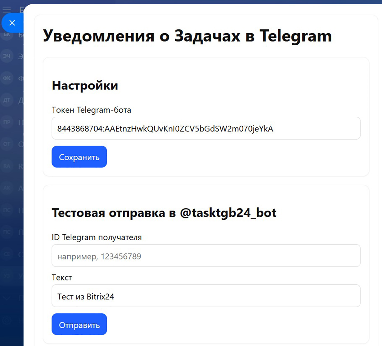 Всем, кто хочет получать уведомления, необходимо указать ID своего Telegram-аккаунта в карточке Пользователя в поле “ID Telegram”, а также подписаться на бота (его компания создает самостоятельно).