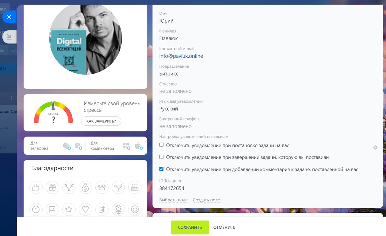 При этом каждый пользователь в своей карточке, в поле “Исключения для уведомлений в Telegram” может указать, какие уведомления ему не нужны.