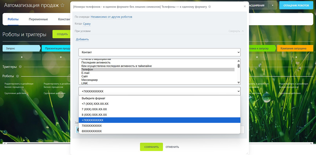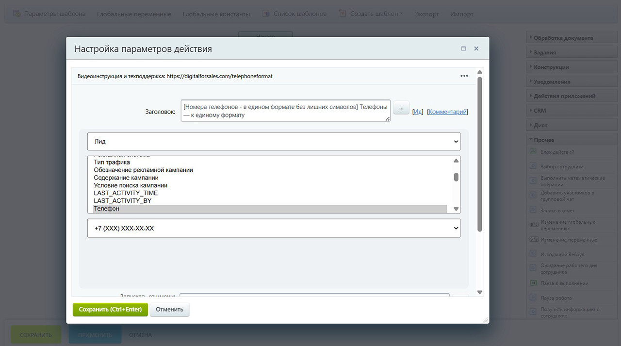 Активити «Формат номера» стандартизирует телефоны: +7, 8 и международные к E.164, выдаёт +7 XXX XXX‑XX‑XX и другие форматы.