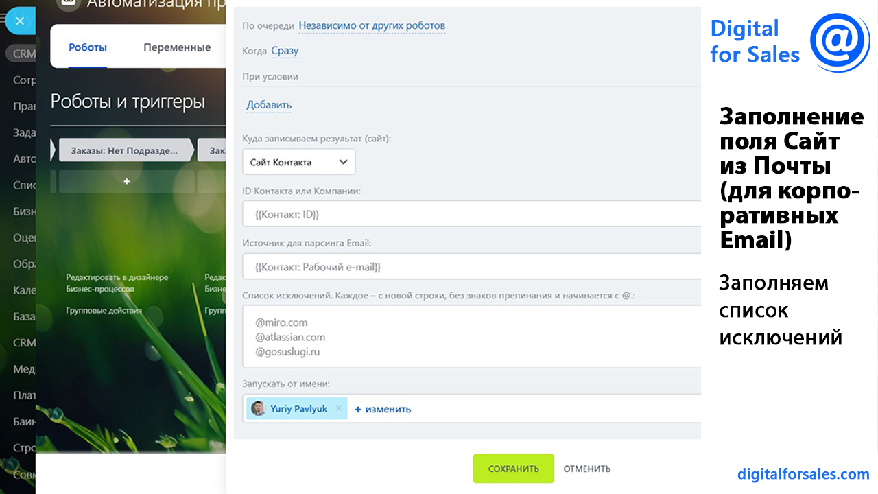 А с помощью умных сценариев можно переработать всю имеющуюся базу Контактов или Компаний и заполнить в них поля Сайт.