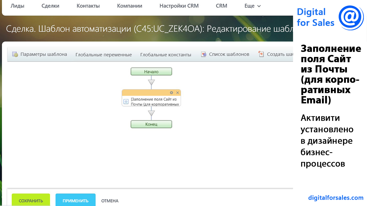 Активити «Сайт из email»: вытягивает домен компании из корпоративного адреса и записывает в поле CRM.