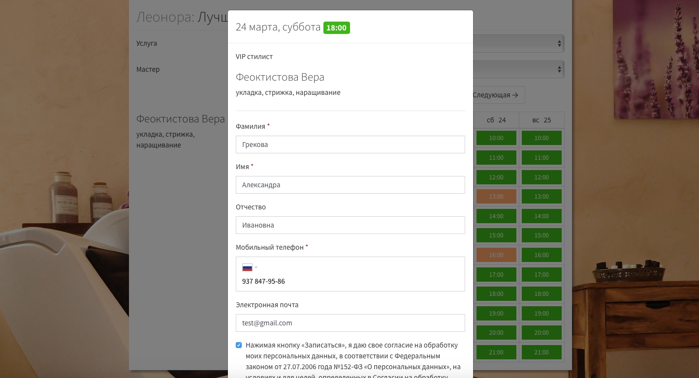 Удобное решение для предварительной записи к юристу, на автомойку, в парикмахерской, салоне, барбершопе (любые услуги). Данные о записи автоматически попадают в CRM Битрикс24. Дайте клиентам возможность записаться к нужному мастеру из реального наличия свободного времени специалиста. Система автоматически напомнит клиенту через СМС или почту о его визите к вам на услугу.