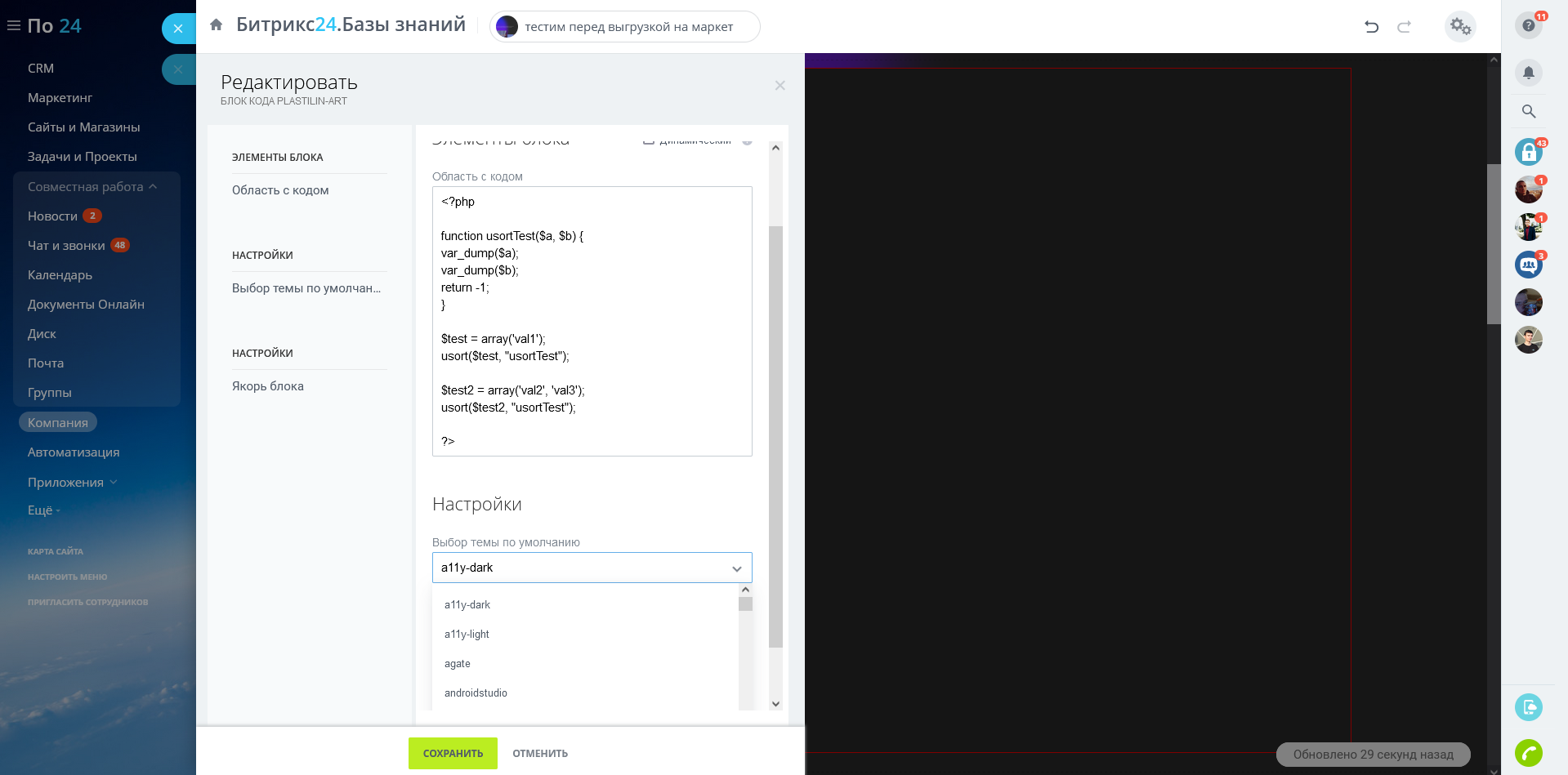 Данный блок используется во всех разделах технологии сайты24 (база знаний, базы знаний групп, сайты, магазины), правильно воспринимает код и устанавливает на страницу, а так же присутствует более 20-ти различных цветовых тем под каждые вкусовые предпочтения.