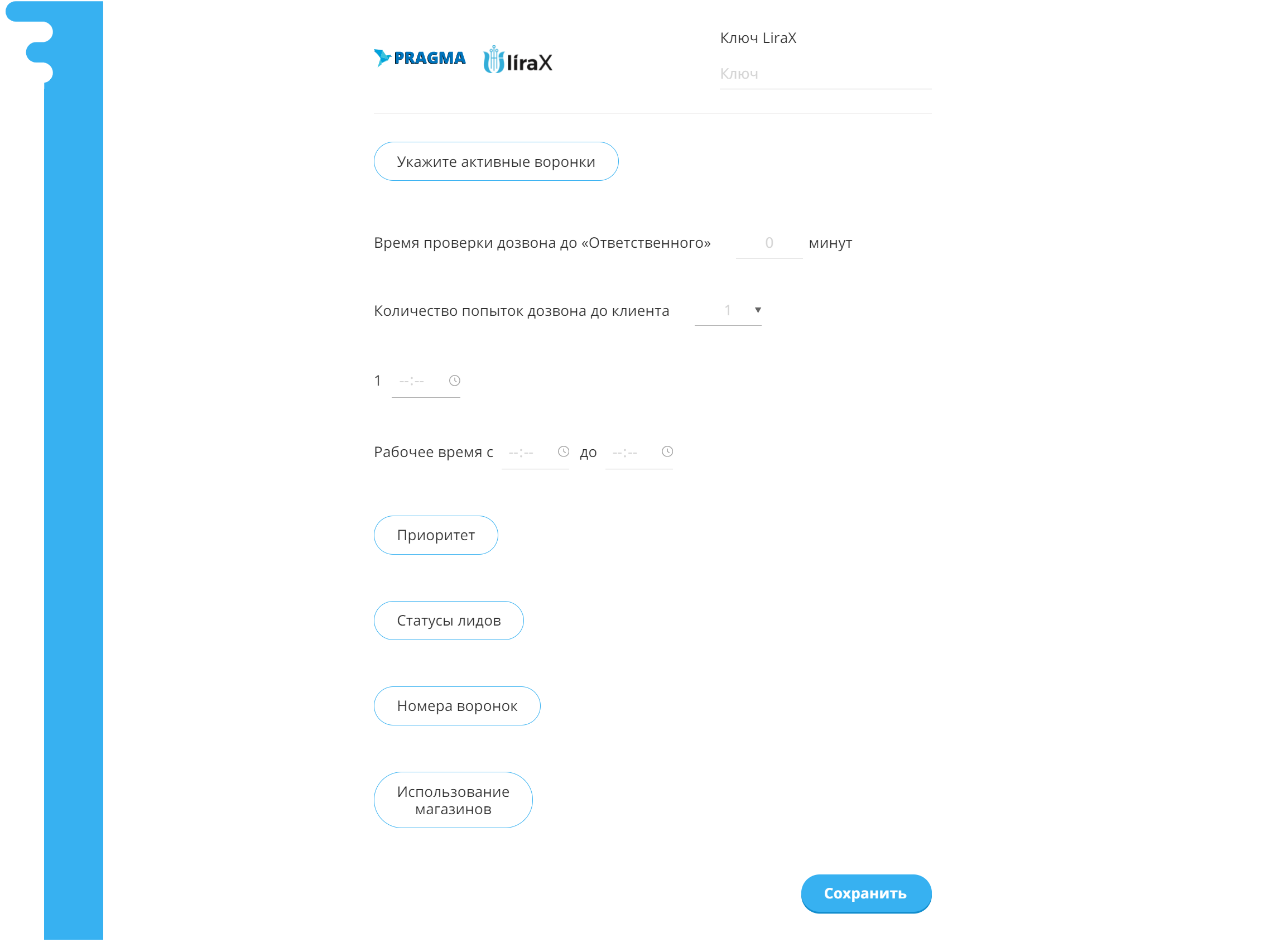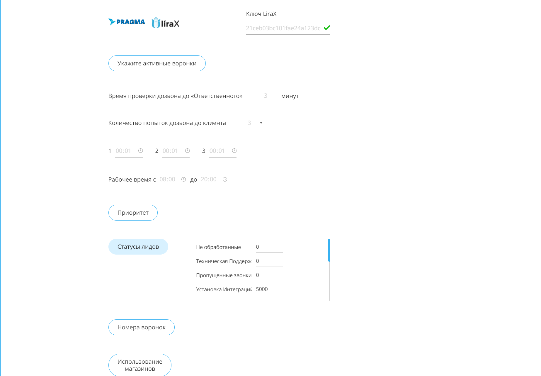 С помощью настроек вы можете сконфигурировать систему под ваш бизнес и добиться максимальной производительности отдела продаж. Доступно указание графиков по времени и дням, количество попыток вызовов, интервалы между попытками и многое другие настройки.