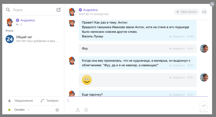 Привет! Я - Андрейка, мастер на анекдоты. Начни со мной говорить, и я поддержу диалог анекдотами и смешными цитатами :)