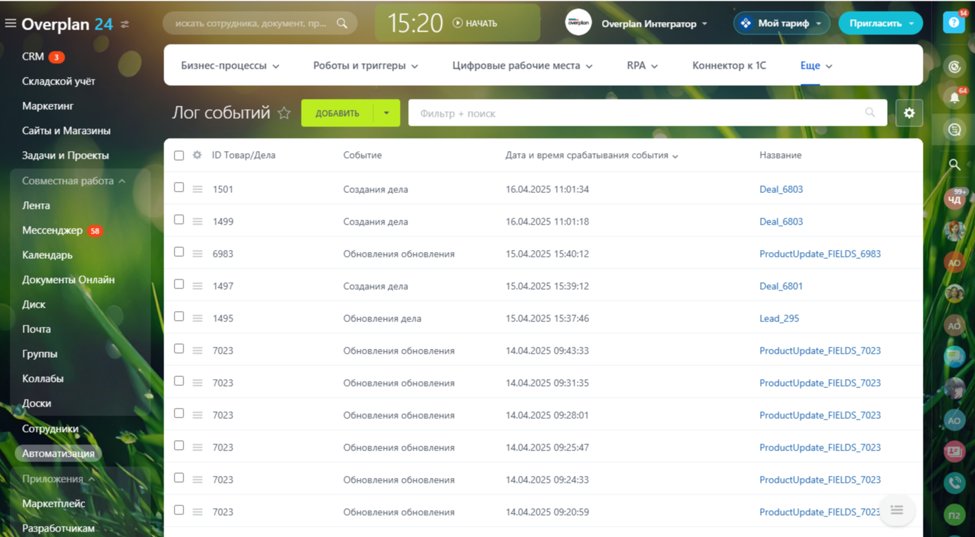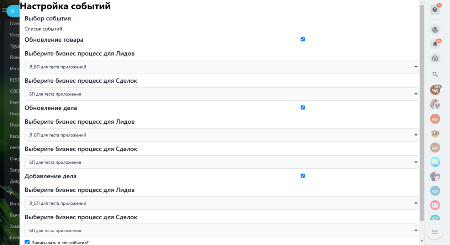 Также, приложение на тарифах от Профессионального и выше, создает список, в котором будет вестись лог событий создания и обновления дел и обновлению информации о товаре.