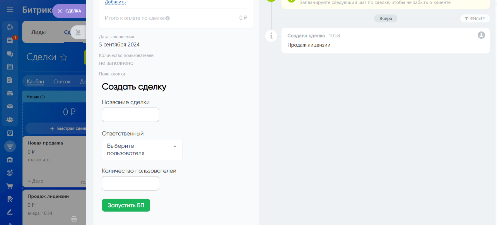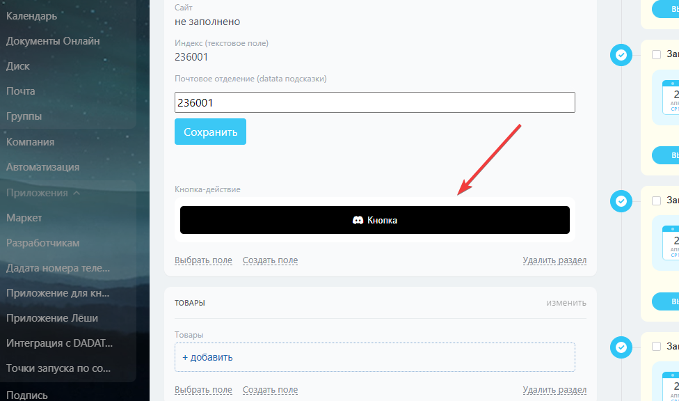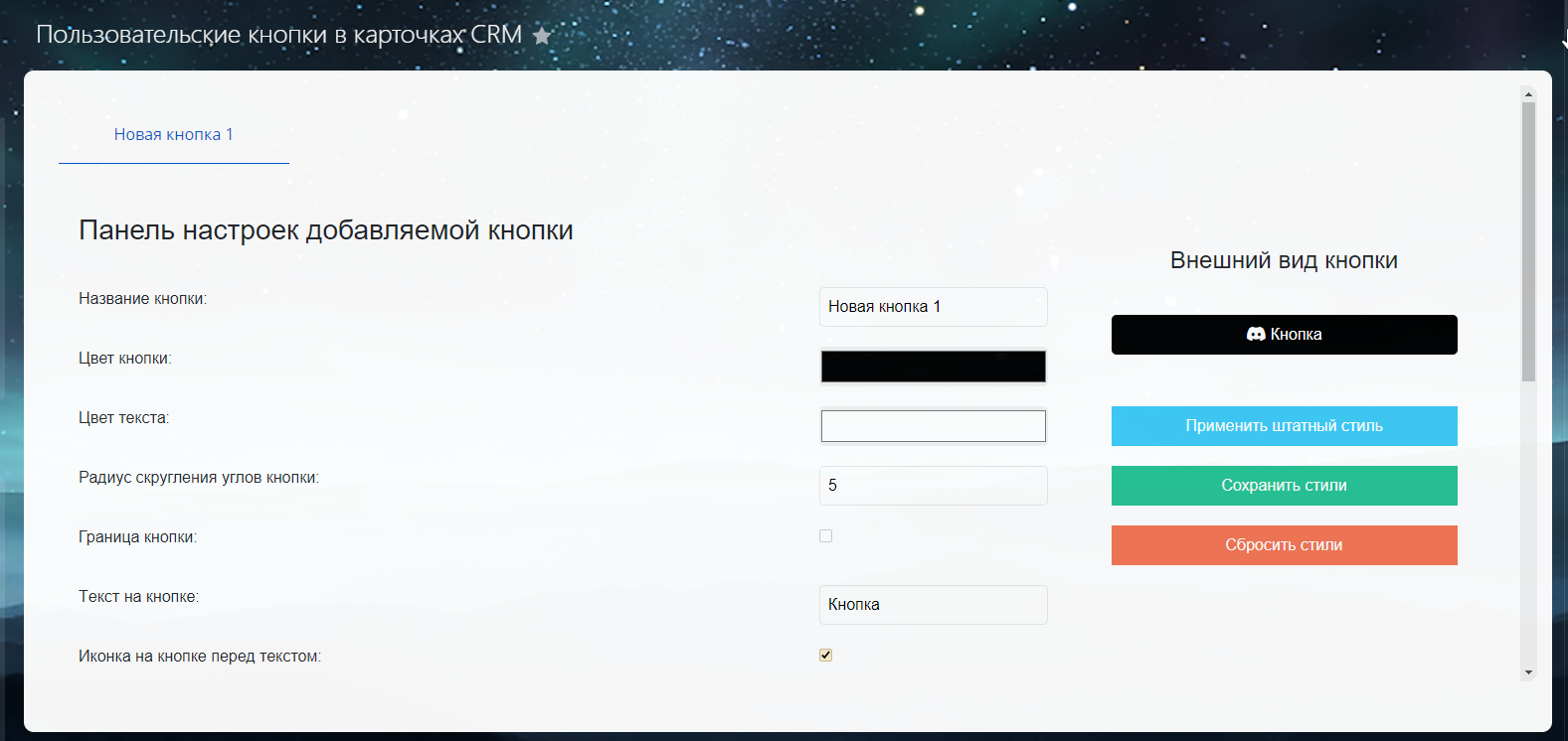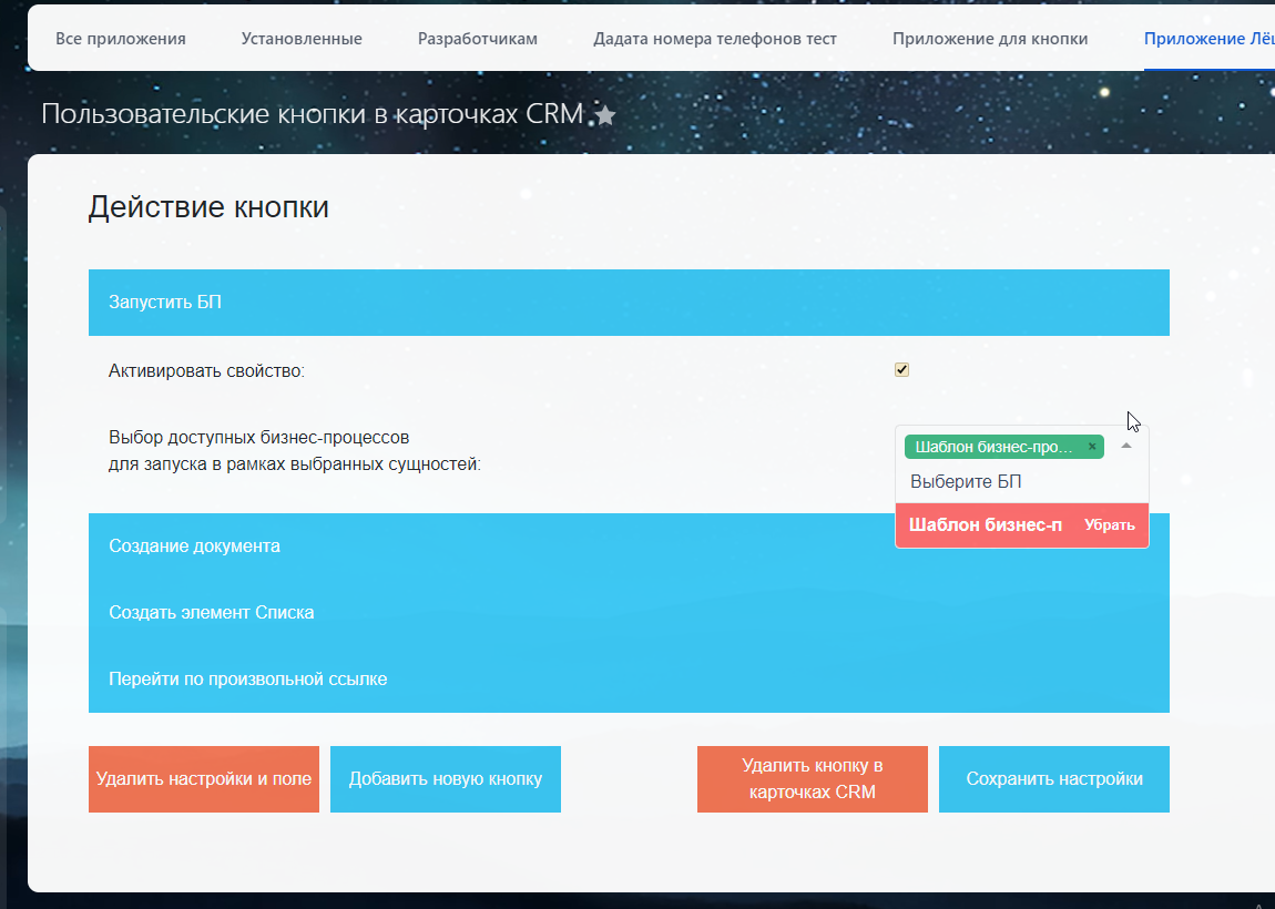 Приложение "Пользовательские кнопки в карточках CRM" позволяет создавать кнопки для карточек CRM (Лиды, Сделки, Контакты, Компании, Счета (новая версия)), настраивать их дизайн и размещать в карточках как пользовательские поля. Для кнопок можно определять действия: