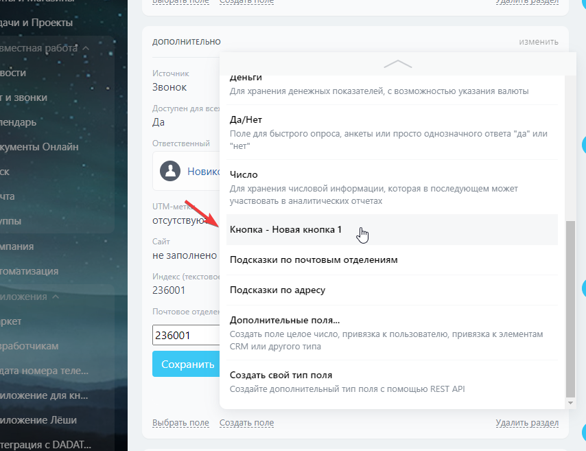 Поддерживаемые типы полей параметров: Строка, Целое число, E-mail, Телефон, Сайт, Текст, Число, Список, Привязка к пользователю.