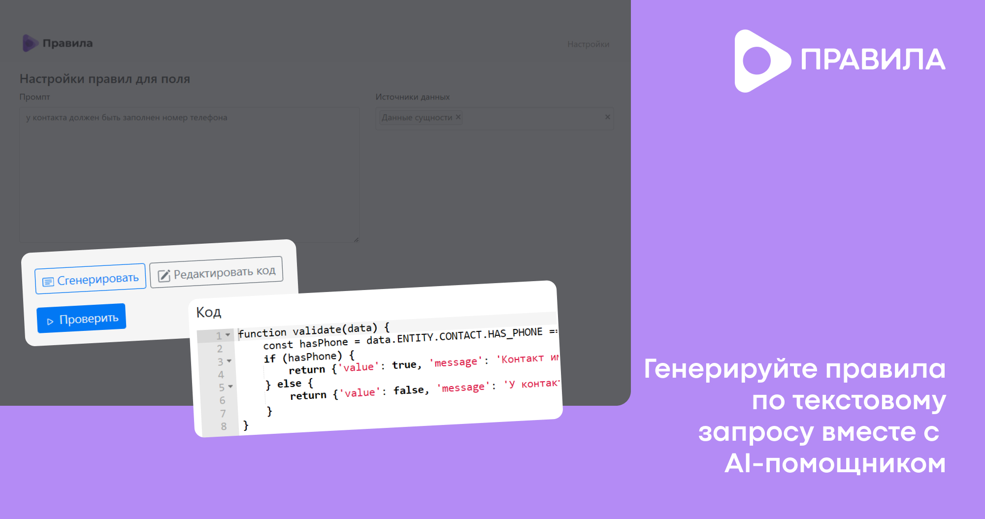 Вам не нужно знать язык программирования, чтобы создать правило: напишите условие в поле "Промпт", и наш AI-помощник самостоятельно его сгенерирует.