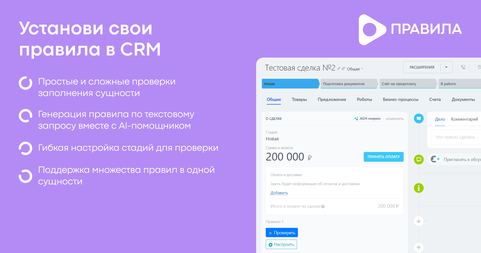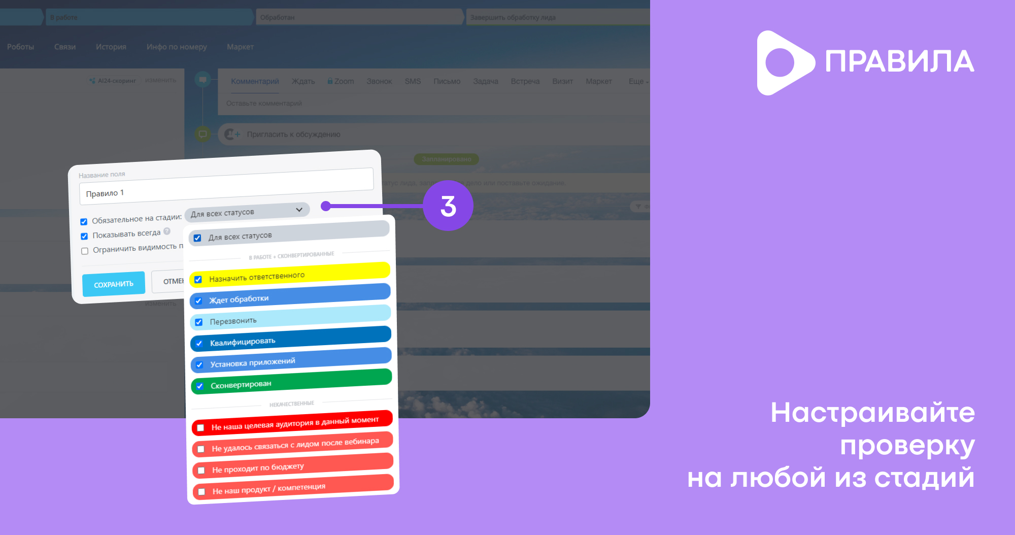 Расширяйте функционал платформы вместе с нами: устанавливайте простые, средние и сложные проверки при заполнении Лидов и Сделок и их перемещении по воронкам продаж.