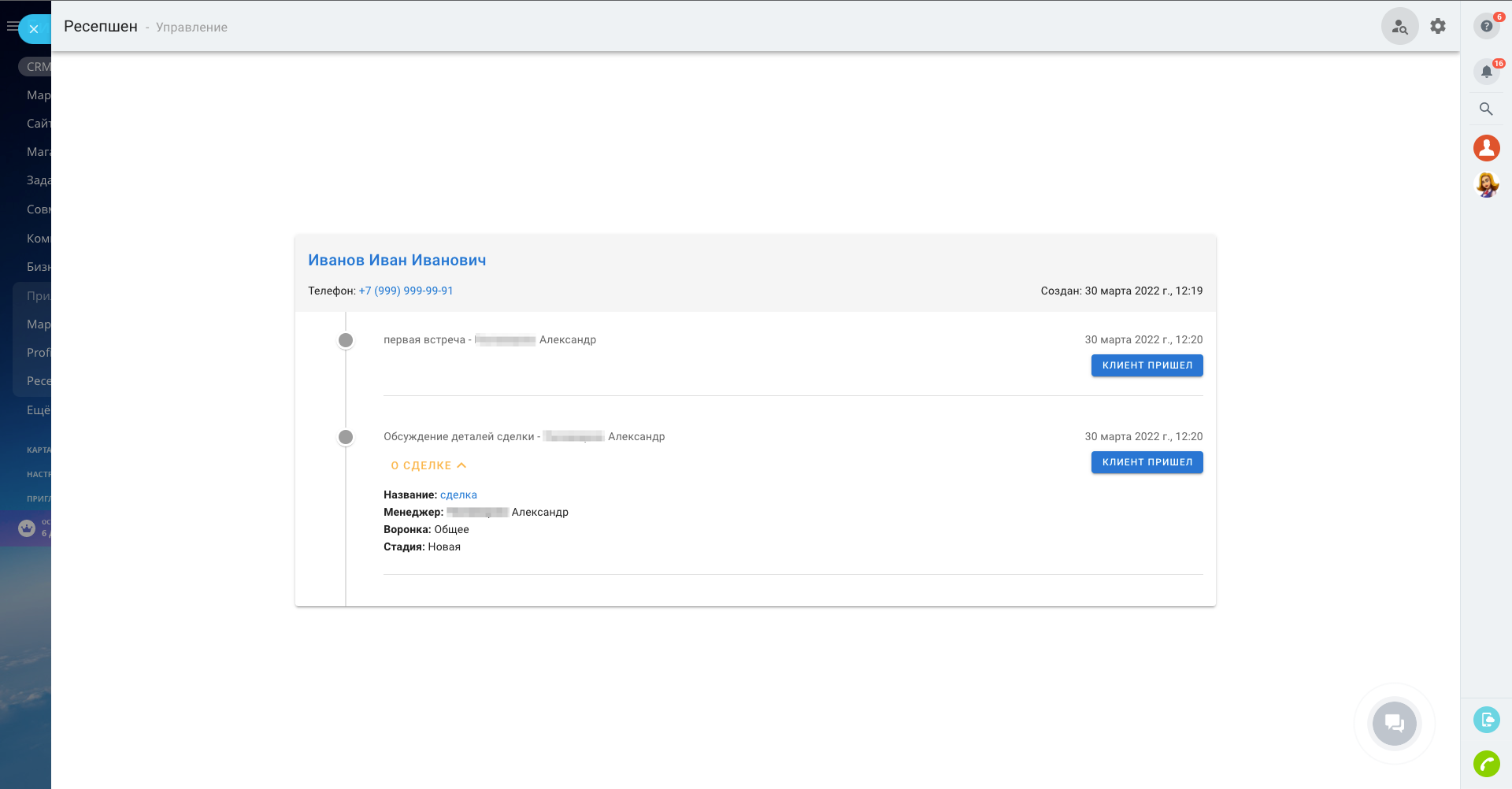 Приложение "Ресепшн" дает возможность настраивать гибкие сценарии работы с пешеходами с помощью настроенных в вашей CRM бизнес-процессов.