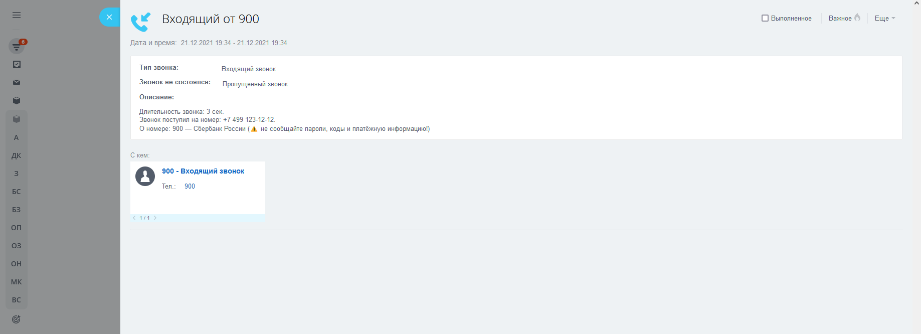 Если вам поступает входящий звонок, но ваши менеджеры не успевают его обработать, то в деле о пропущенном звонки в его описании будет добавлена информация о номере телефона. Таким образом, вы сможете отфильтровать спам звонки и просто на них не перезванивать и не тратить время и деньги.