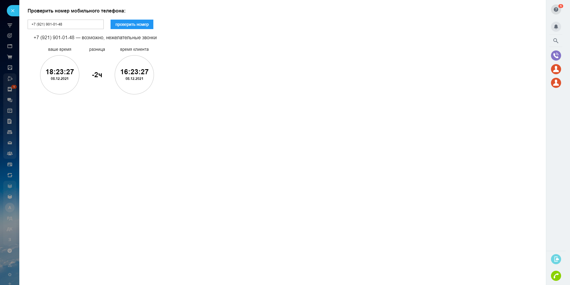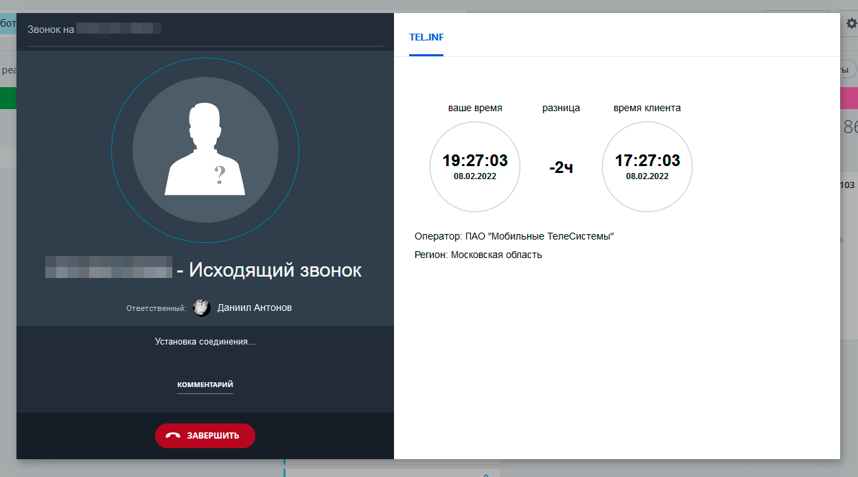 В момент входящего или исходящего звонка в карточке звонка Битрикс24 появится информация о: разнице во времени, операторе и регионе абонента.