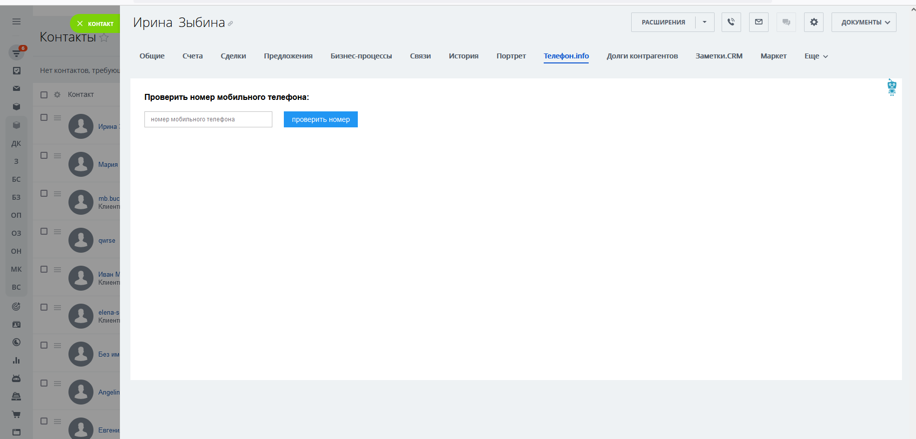 Так же для вашего удобства в сущности лид, сделка, контакт, компания добавлена вкладка "Телефон.info", где вы можете выполнять вышеуказанные действия.