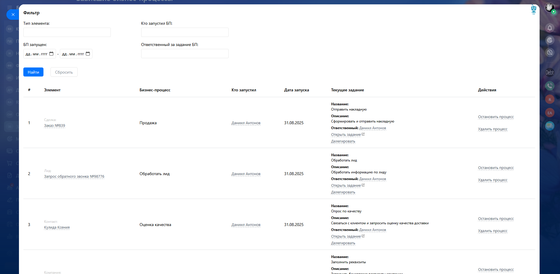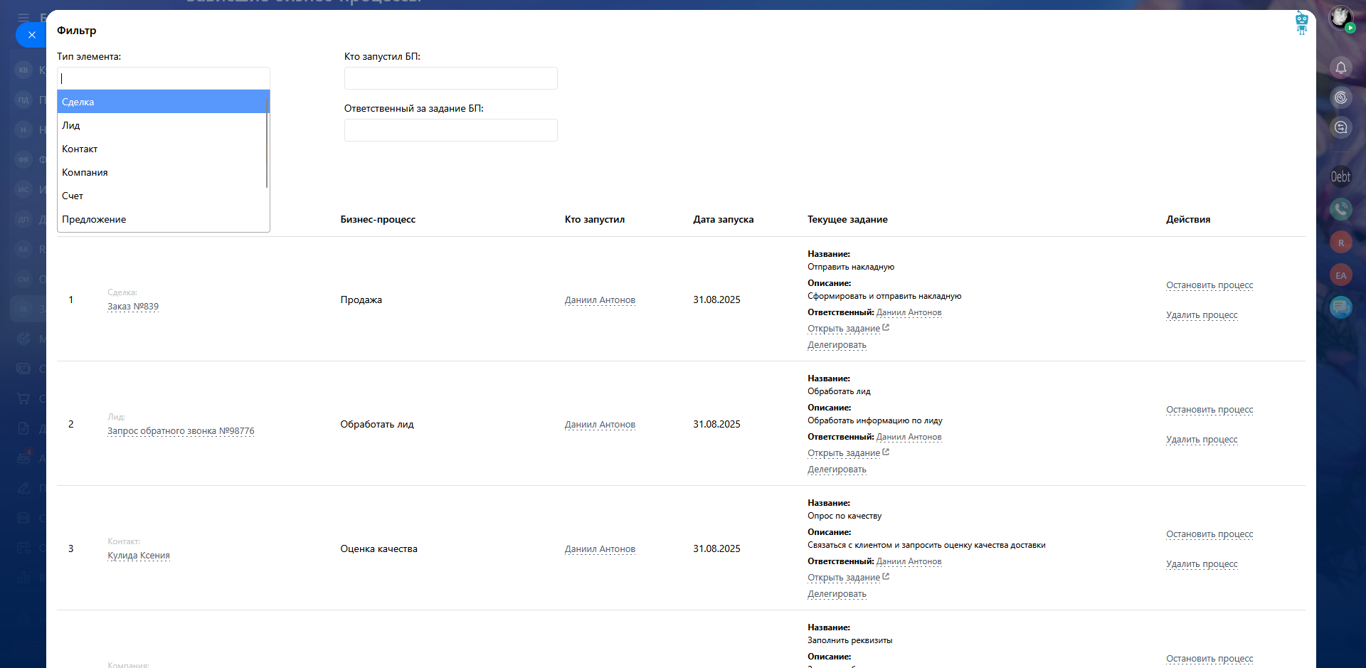 В зависимости от прав доступа (штатные права Б24 по доступу к CRM и т.д.) текущего сотрудника, доступны действия над бизнес процессами: