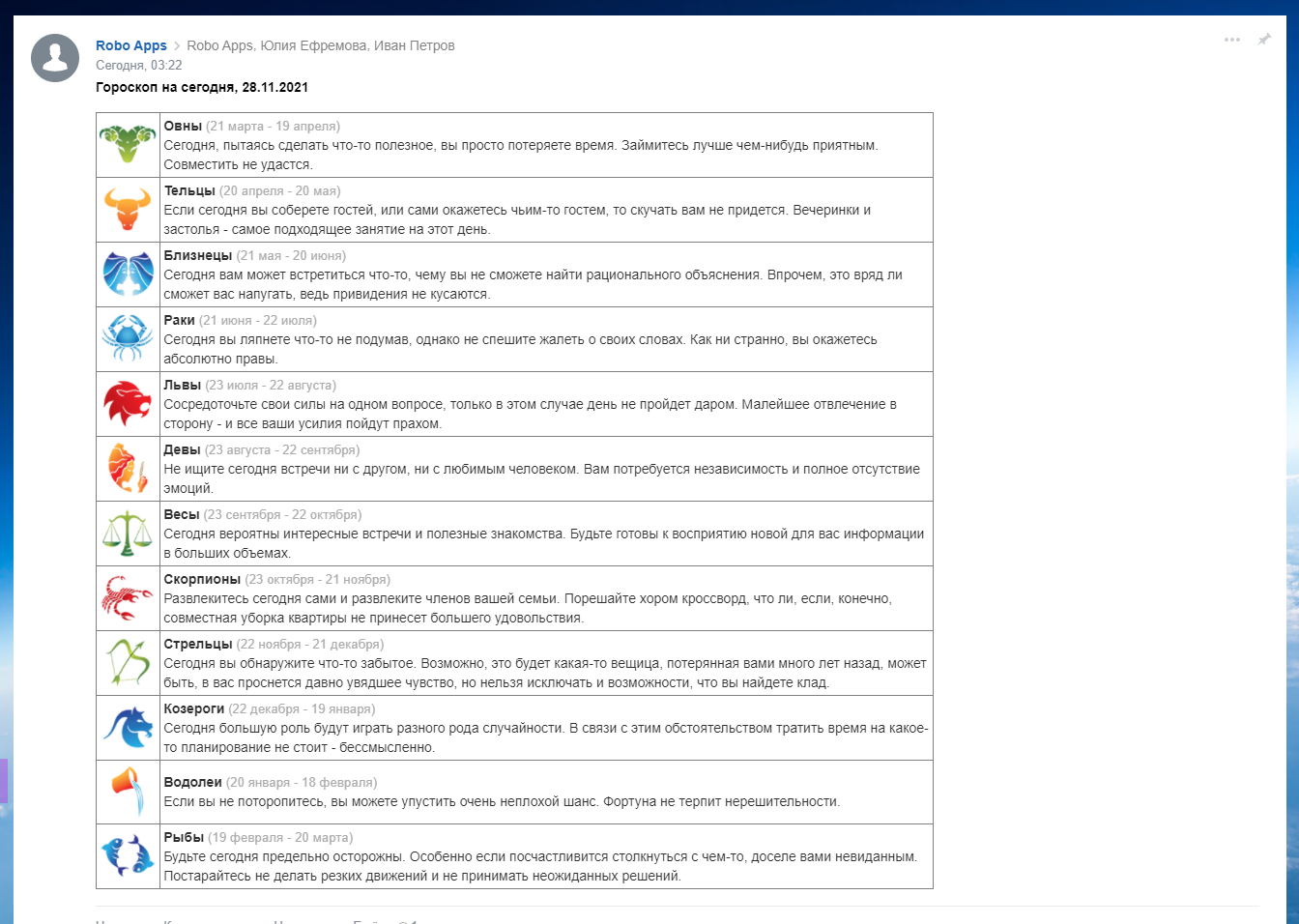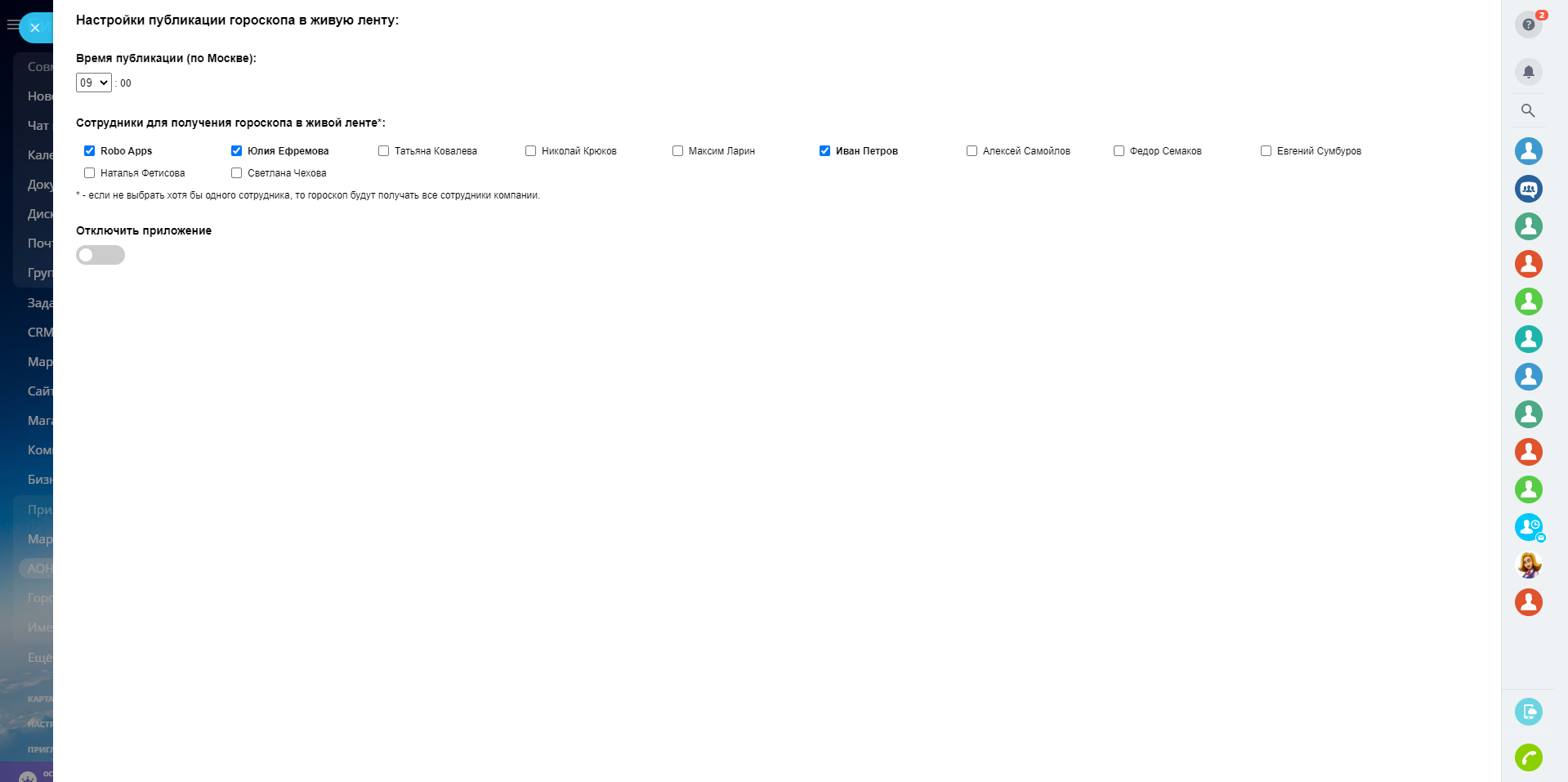 - выбрать получателей гороскопа (сотрудников компании) в живой ленте.